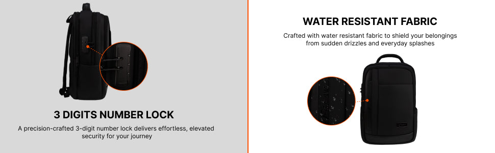 Includes a number lock for added security, and is made from premium water-resistant material. Designed with ergonomic padded back support and soft padded shoulder straps for all-day comfort. - Travel-Friendly & Reliable Warranty: