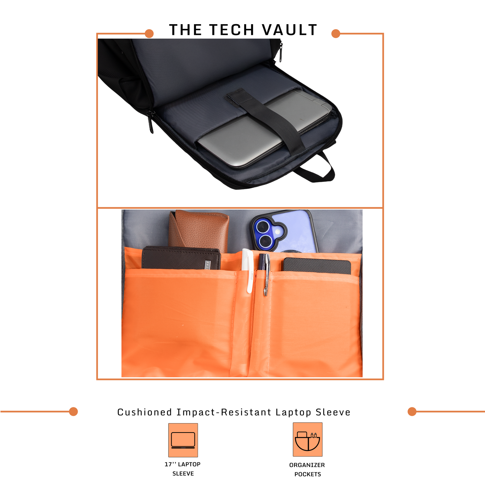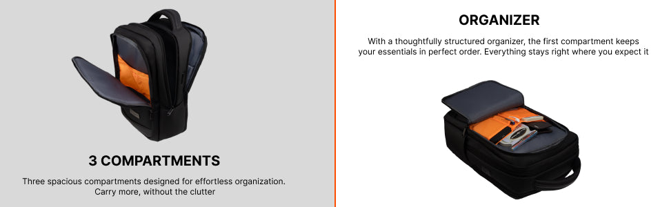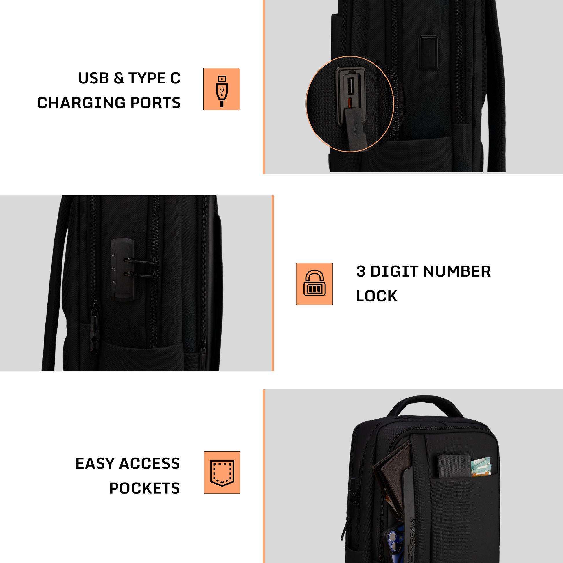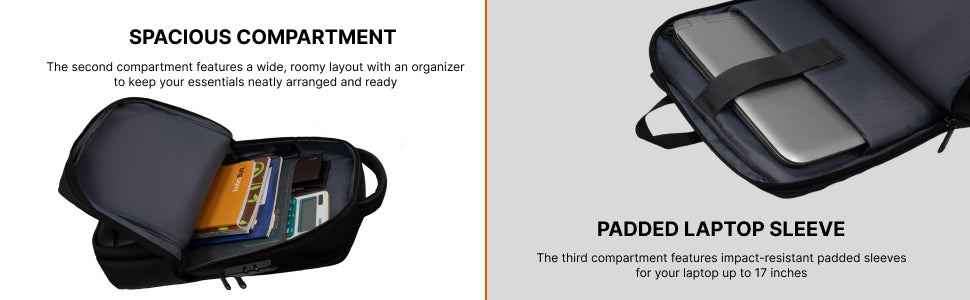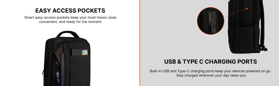 Comes with 3 roomy compartments and 2 utility pockets, offering ample space for a 17-inch laptop, books, and daily essentials. - Smart Charging Convenience: