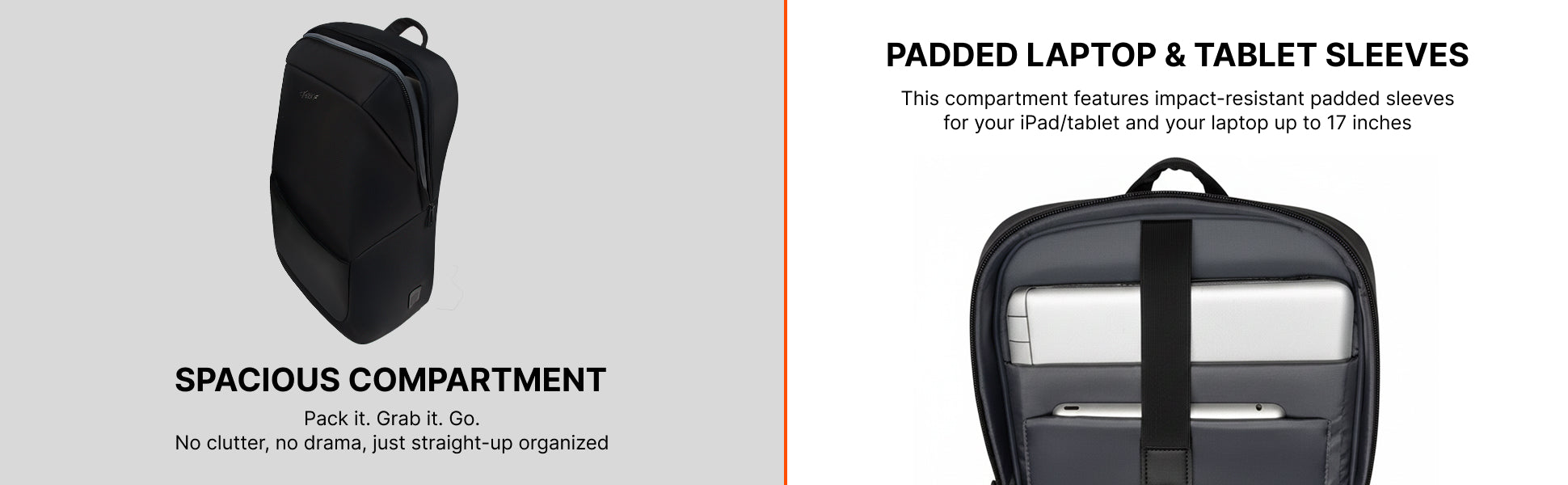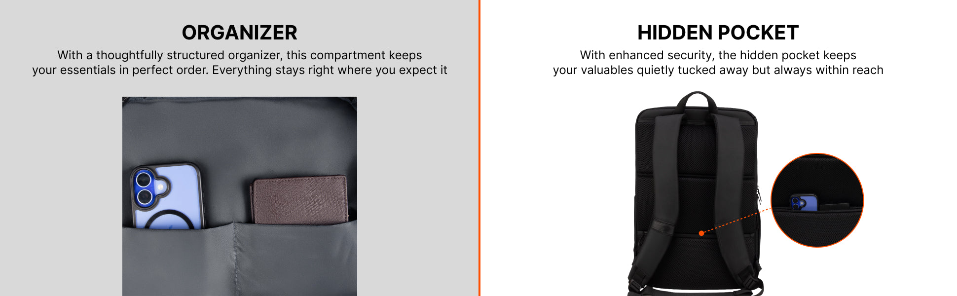 Auronix is built around purposeful practicality, featuring a padded compartment for 17-inch laptops along with a dedicated tablet sleeve, keeping both devices safe and organized. With 1 main compartment and 2 pockets, including a discreet hidden pocket, your essentials remain accessible yet secure—perfect for workdays on the move.