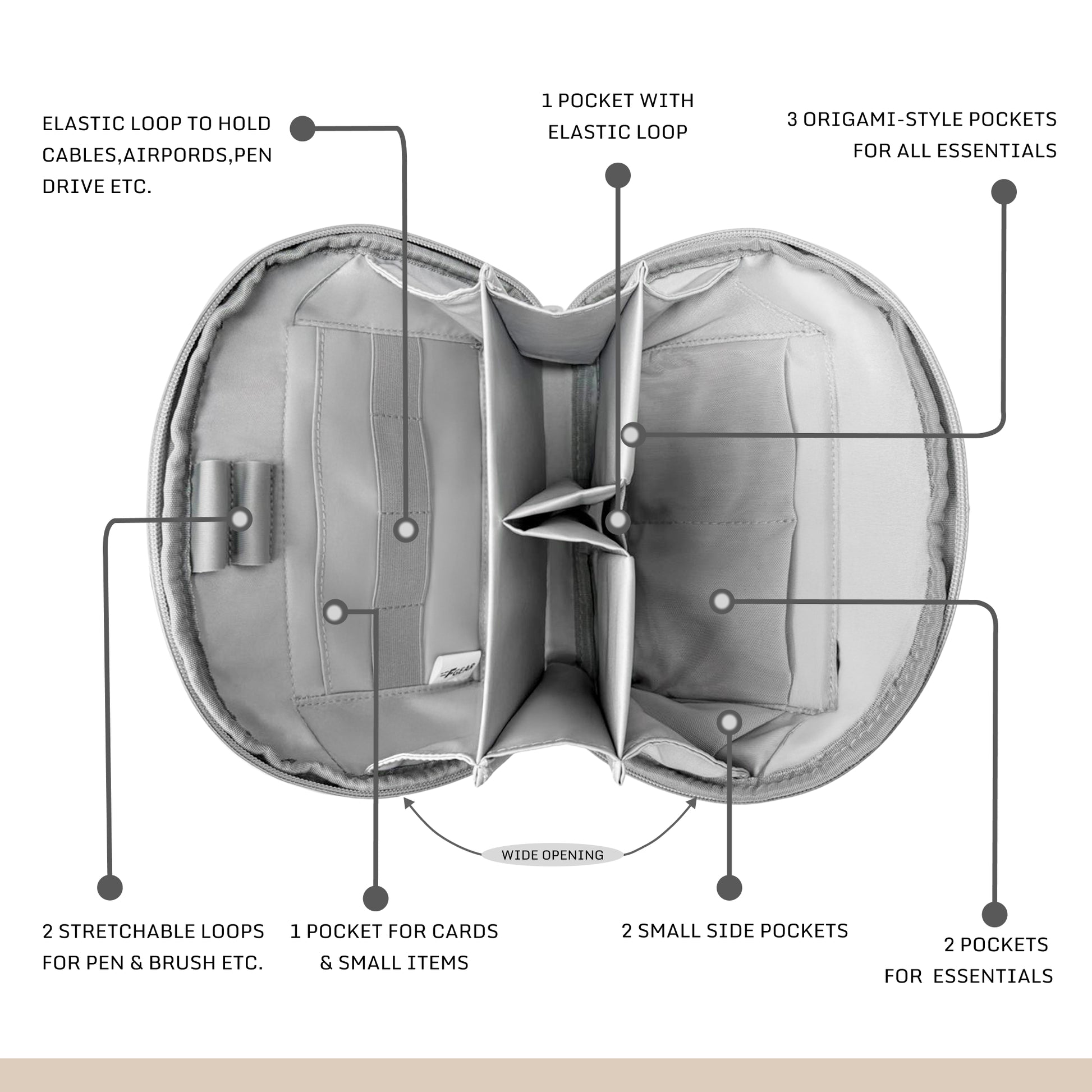 Belvoir is crafted for multi-use functionality—ideal for pendrives, hard drives, cables, earphones, makeup, skincare and personal accessories. Its layout includes 1 main compartment and 1 front pocket, offering quick access and neat separation of essentials.