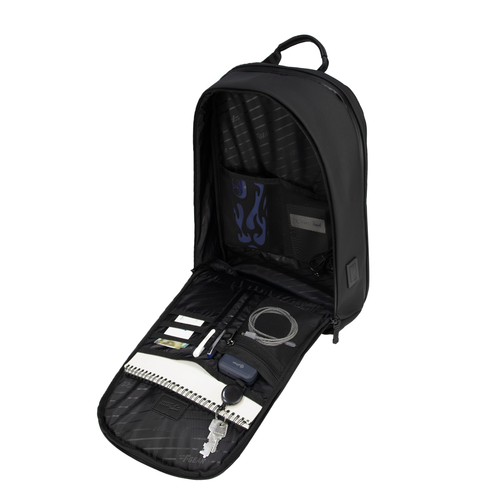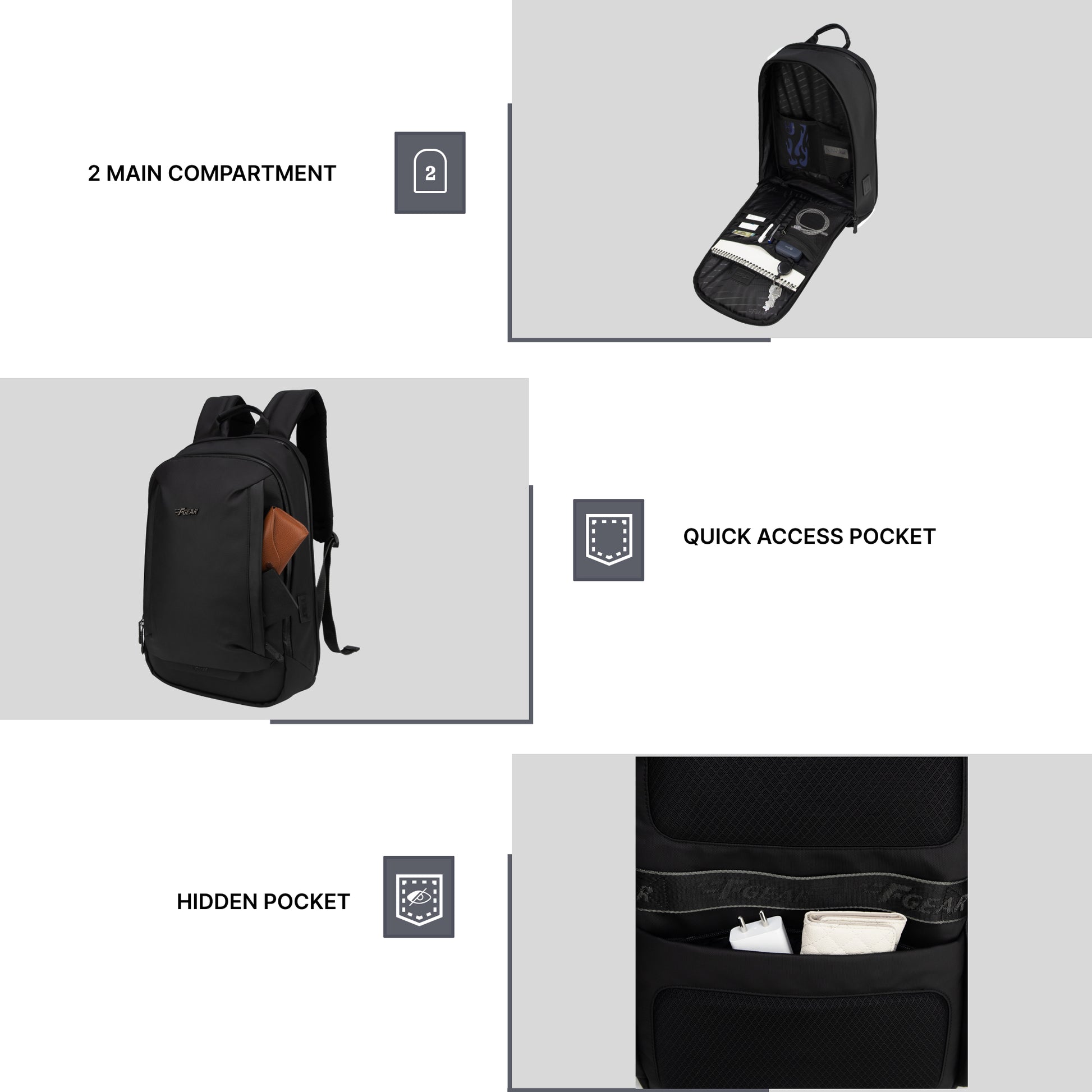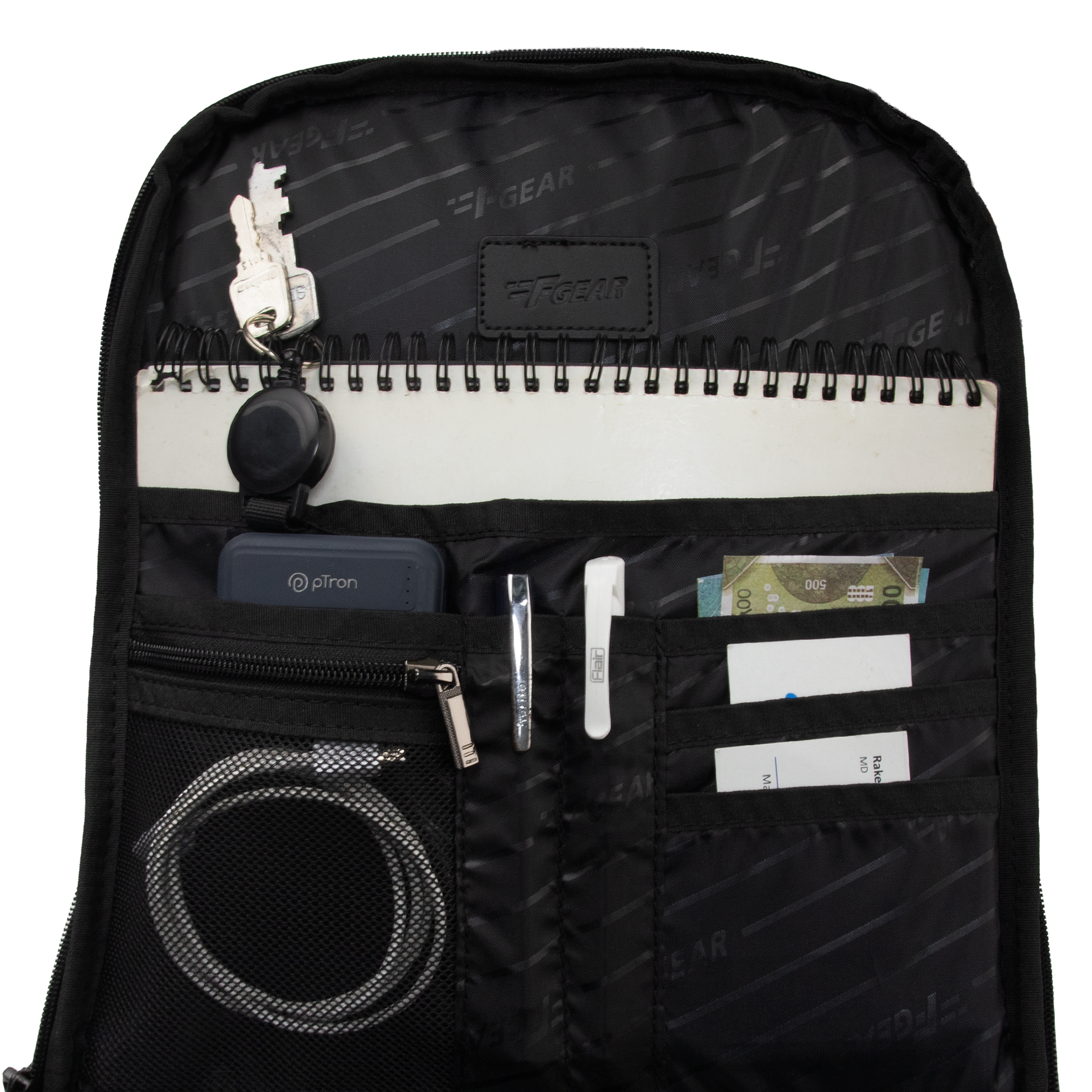 The F Gear Capri Premium Laptop Backpack is a modern carry designed for office, college, travel, and everyday use. Featuring a 180° full-opening design, Capri allows easy packing and quick access to essentials. With dimensions of 46 × 30 × 14 cm and a weight of 0.8 kg, it offers a smart profile with ample organized storage for all-day comfort. The backpack includes 2 well organized compartments, comprising a padded laptop sleeve & a dedicated padded tablet sleeve, 1 front pocket and a hidden back anti-theft pockets. The laptop sleeve securely fits laptops up to 15.6 inches and tablets up to 12.9 inches, protected by soft velvet lining and shock-absorbing padding. Inside, a retractable key holder keeps essentials in place, while a zipper card pocket and sunglass holder on the shoulder strap provide quick access on the move. Crafted from water-resistant durable Oxford fabric with a water-resistant diamond-lattice lining, Capri is built for durability. A breathable padded back panel and cushioned shoulder straps ensure comfort, while the luggage strap makes airport travel effortless. Equipped with USB and Type-C charging ports, along with headphone access, F Gear Capri keeps you powered and connected wherever the day takes you. 1 year carry-in warranty against all manufacturing defects Storage: Compact yet spacious design with 20 L capacity and dimensions 32 × 14 × 45 cm, ideal for office, college, commuting, and travel