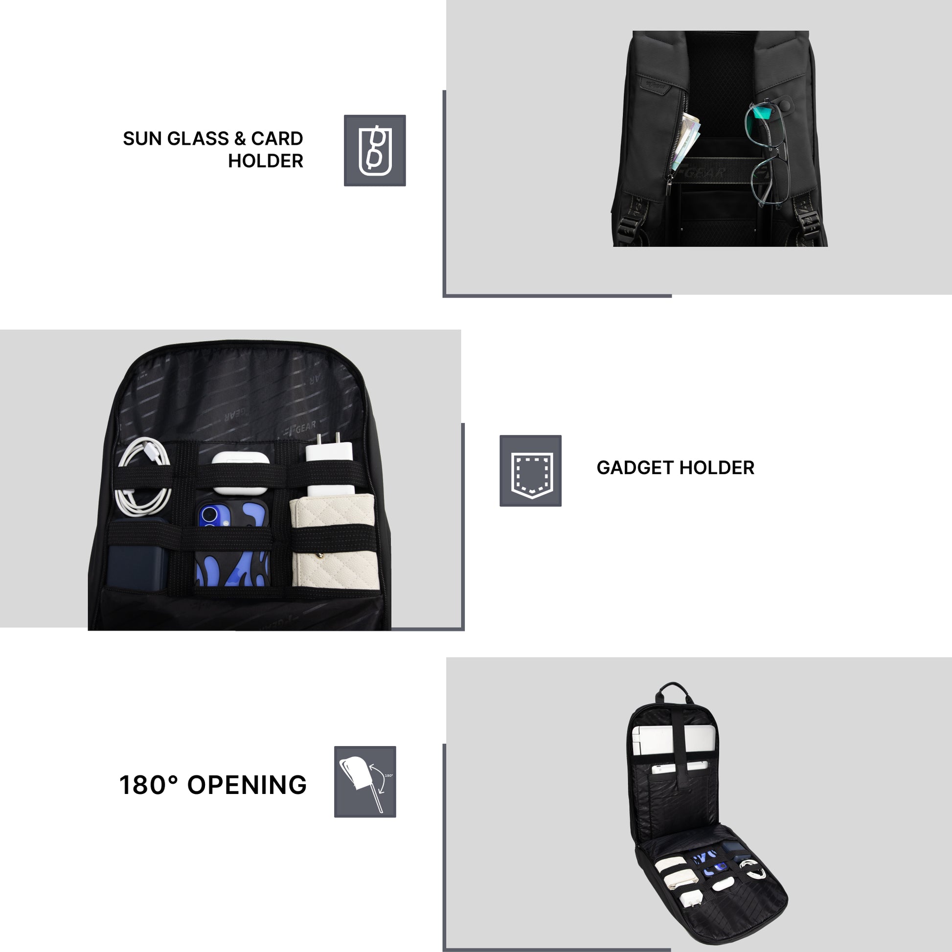 - Travel-Ready & Connected: Luggage strap, USB & Type-C charging ports, and headphone access. Water-resistant durable fabric with breathable padded back. 30 × 14 x 46 cm | 0.8 kg. 1 year carry-in warranty against all manufacturing defects