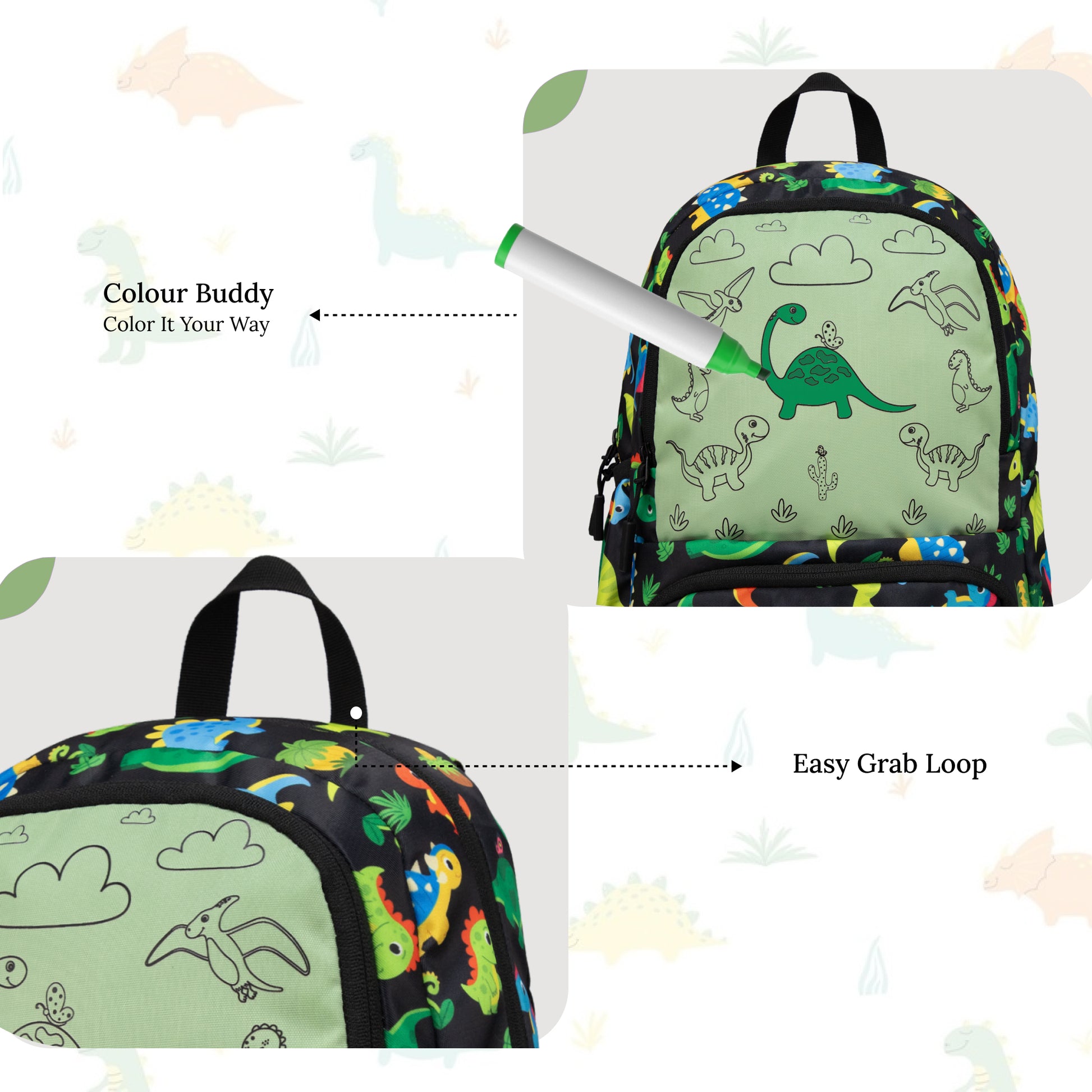 The Colour Buddy Black Dino Backpack is perfect for kids who love fun and adventure. Featuring colourful and playful dinosaur prints on a stylish black base, the unique print allows children to colour on it, this backpack adds a lively and exciting touch to everyday routines. The cheerful dino theme makes it a great choice for school, travel, or daily outings, bringing a sense of fun wherever kids go. Children can enjoy expressing their creativity by adding their own colours to the prints, — carry your art everywhere you go, turning this backpack into a unique, customized piece. Made from durable soft-touch fabric, this backpack is lightweight at just 340 g, ensuring comfortable carrying throughout the day. It comes with one spacious main compartment to hold books and daily essentials, along with two front pockets for neatly organizing smaller items like stationery, snacks, or accessories. A side water bottle holder provides added convenience for carrying a bottle securely. With practical This backpack comes with a 1 Year Carry-in Warranty against all manufacturing defects, ensuring dependable quality and long-lasting performance.