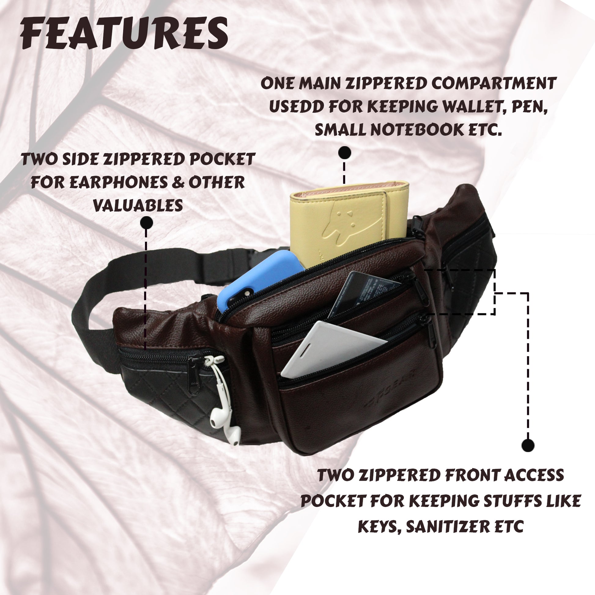 ‘Czar’ by F Gear is a fanny pack which is spacious, trendy, exclusive & easy to carry. This is unmatched in terms of looks and personality. To describe it briefly here are the following points: 1. This having a two small front zippered pockets & two side zippered pockets suitable for many small accessories like keys, pen drive, Bluetooth etc. 2. It has one pocket in the front suitable to keep your mobile. 3. One back pocket suitable passport/mobile etc. 4. This fanny pack has a huge main compartment suitable for wallet, small notepad, pen, sunglasses & other belongings. 5. This fanny pack comes with a Premium YKK Japanese Zippers& sliders with an adjustable waist strap. 6. This fanny pack is made of soft leatherette fabric and is treated to make it water-resistant. 7. Comes with The F Gear promise of quality and durability.