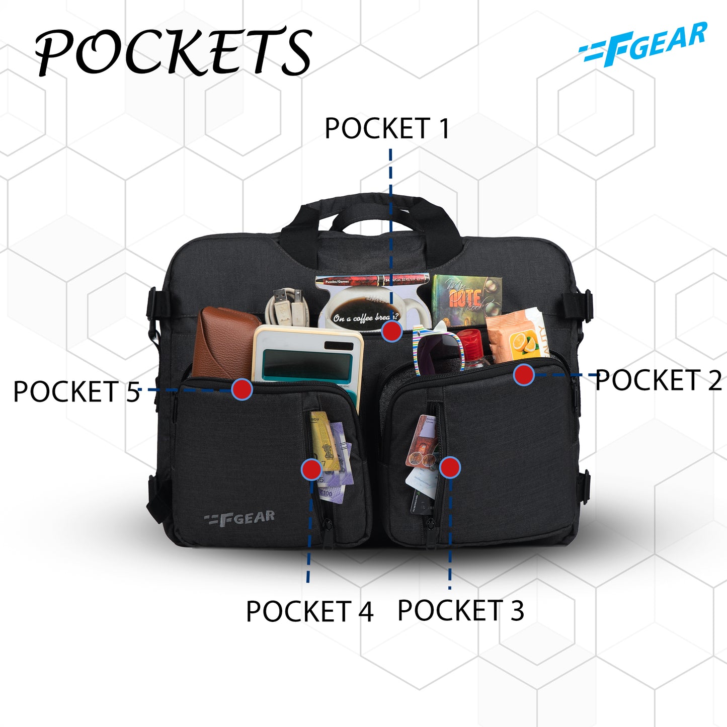 COMPARTMENTS & POCKETS: (2 compartments + 5 pockets) Featuring 2nd compartment with padded laptop (upto 17 inches) & ipad sleeve along with an organizer while 1st compartment consists of an organizer.
