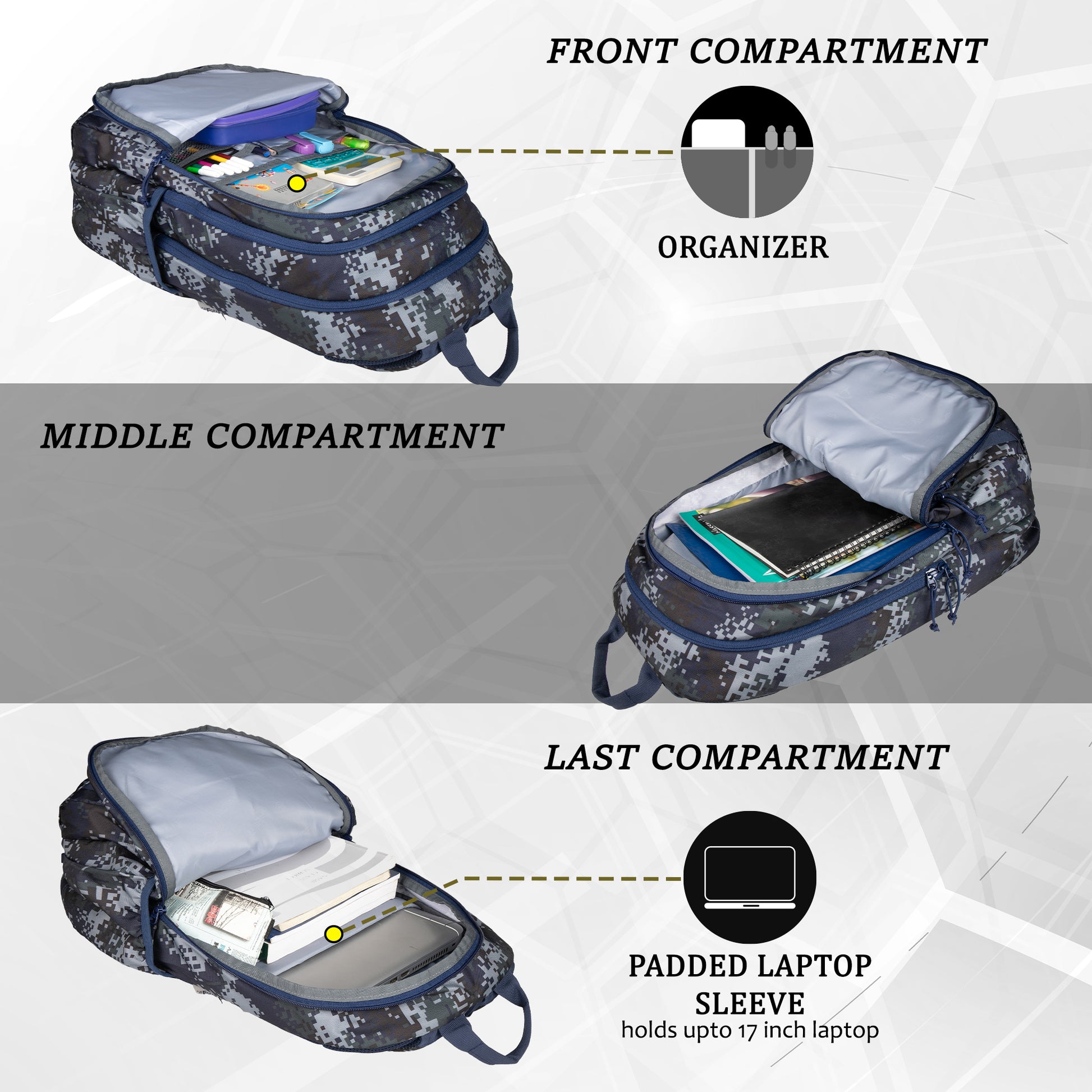 - Air Mesh Padding at the Back panel and shoulder straps for utmost Comfort.