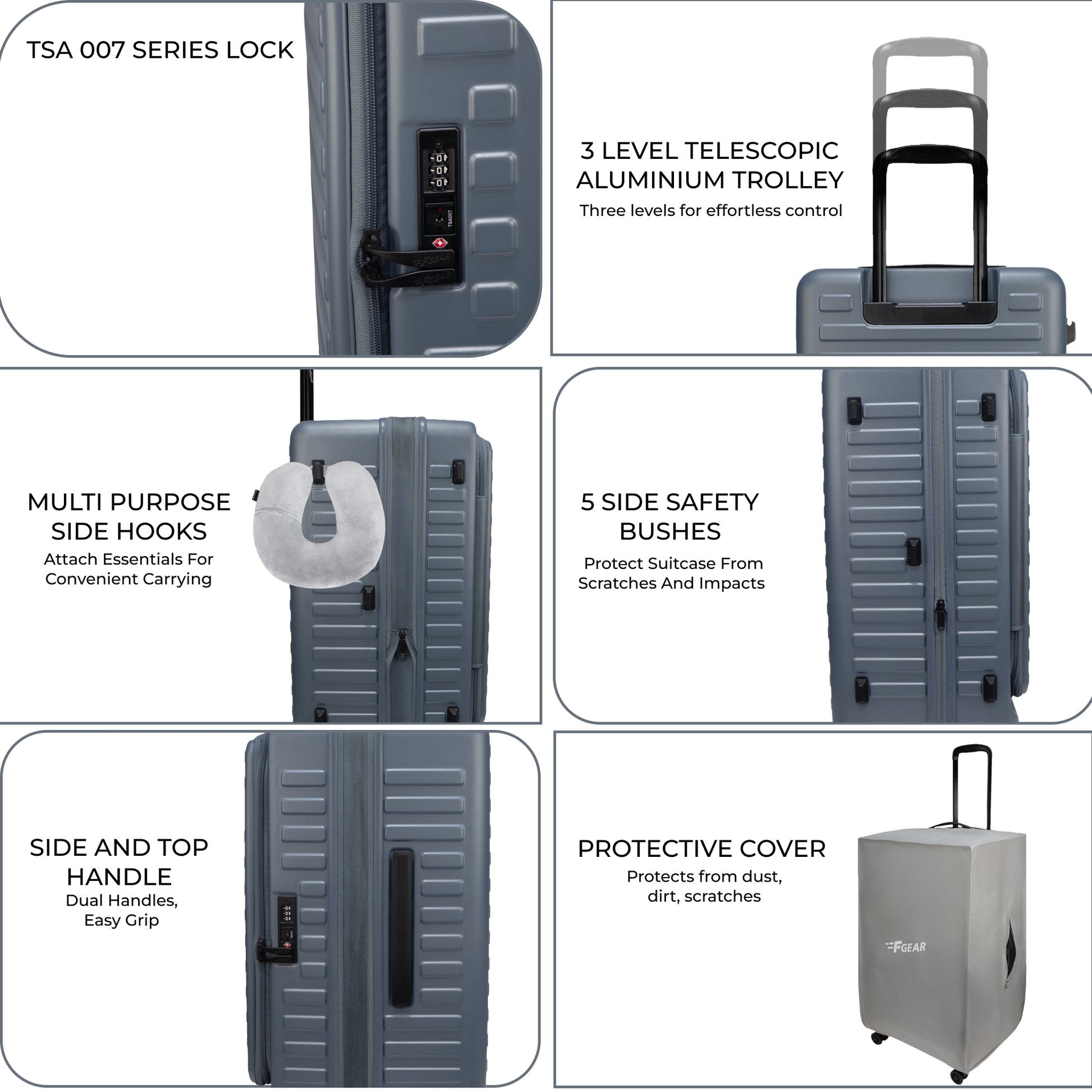 Handling is effortless with the 3-level telescopic aluminium trolley, supported by top and side handles for easy lifting and manoeuvring. For security, the suitcase is equipped with an anti-theft zipper and a reliable TSA 007 series number lock, ensuring international travel safety and airport-friendly security checks. The included protective luggage cover keeps your strolley clean and protected between trips.