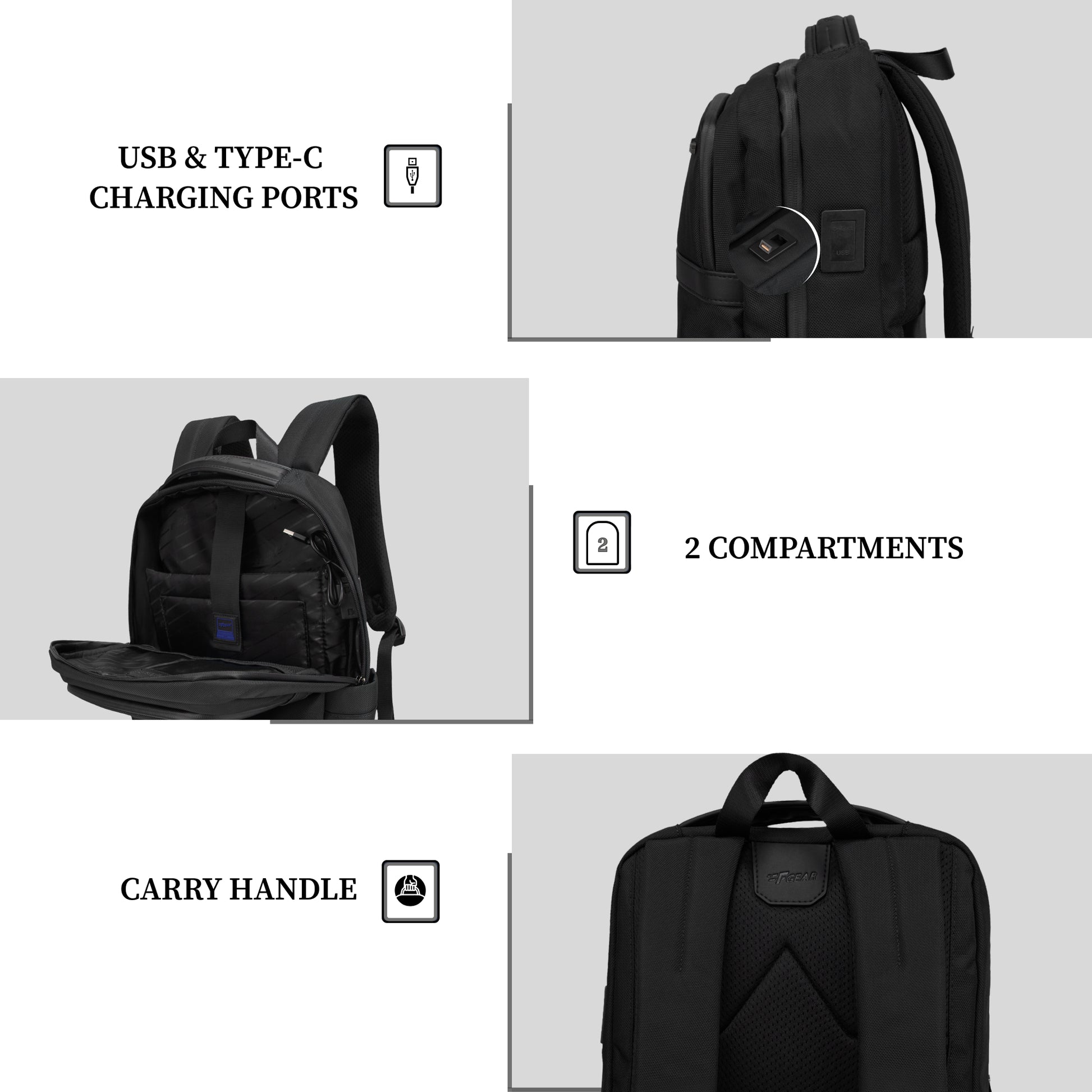 The F Gear Hallstat Laptop Backpack blends modern style with everyday functionality for students, professionals, and travelers. Crafted from durable materials, it features dedicated laptop, tablet, and iPad sleeves to securely fit devices up to 17 inches. With a 20 L capacity and compact dimensions of 32 × 14 × 45 cm, Hallstat offers ample storage while maintaining a smart, travel-friendly profile. Designed for smart organization and security, the backpack includes two spacious compartments for electronics, documents, chargers, and daily essentials. A hidden zipper pocket keeps valuables safe, while the 2 side water bottle holders & Sunglasses holder on the shoulder strap adds everyday convenience. Built-in USB and Type-C charging ports lets you stay powered on the move. Comfort and travel ease come together with padded shoulder straps and a breathable back panel that reduce strain during long commutes. The integrated luggage strap allows easy attachment to trolley handles for hassle-free travel. Stylish, practical, and thoughtfully designed, F Gear Hallstat is a reliable companion for work, college, and travel.