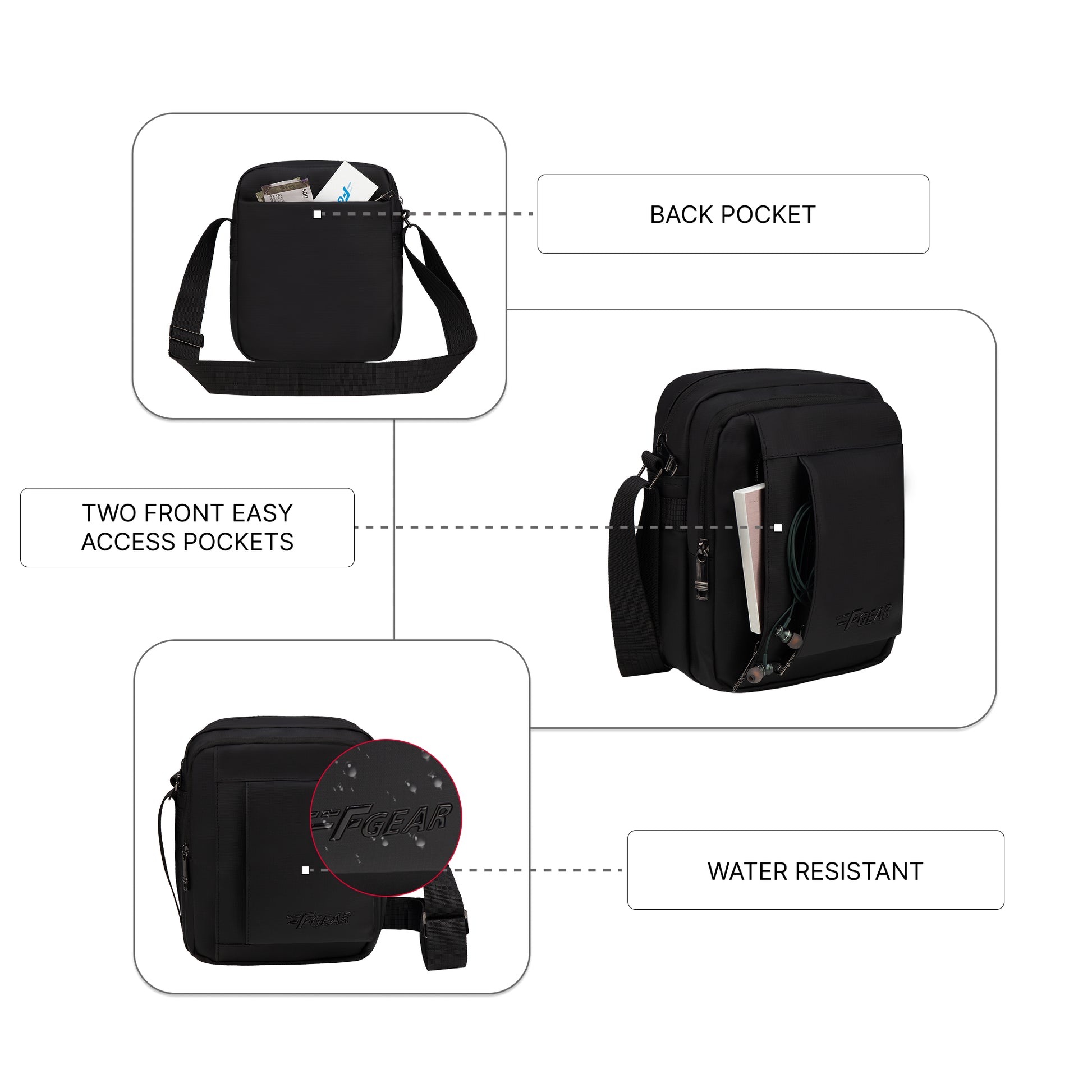 The F Gear Hamburg 5L Crossbody Sling Bag is designed for those who want extra space without compromising on style. Crafted from soft-touch premium fabric, it delivers a refined look with everyday durability. The dual-compartment layout with three pockets keeps essentials neatly organised, while the roomy 5L capacity makes it ideal for daily use and travel. Lightweight at 460 g, finished in black, and featuring an adjustable strap up to 150 cm, it offers comfortable carry backed by a 1 Year Carry-In Warranty.
