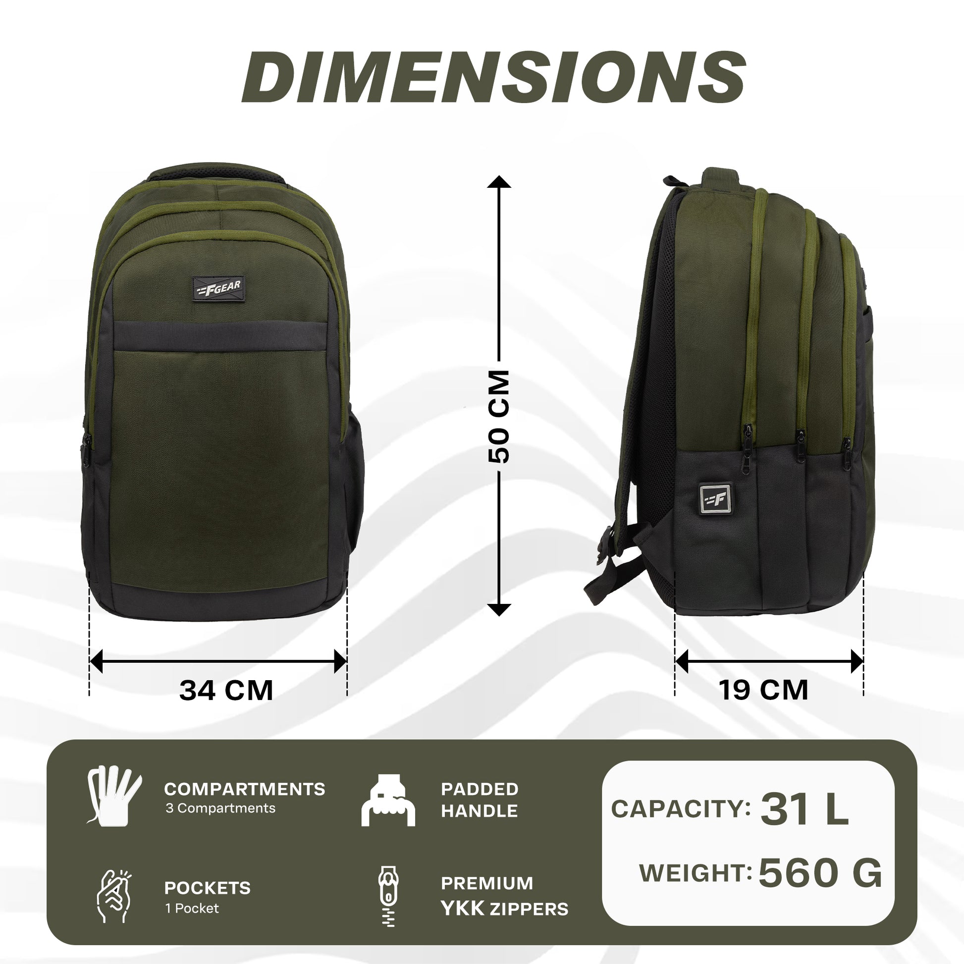 - STORAGE:Total capacity of 31 L, Dimensions: (L) 34 x (W) 19 x (H) 50 cm. Weight 560 g. Suitable for school, college, tuition, office, formal, casual, backpack, travel bag, corporate business backpack.