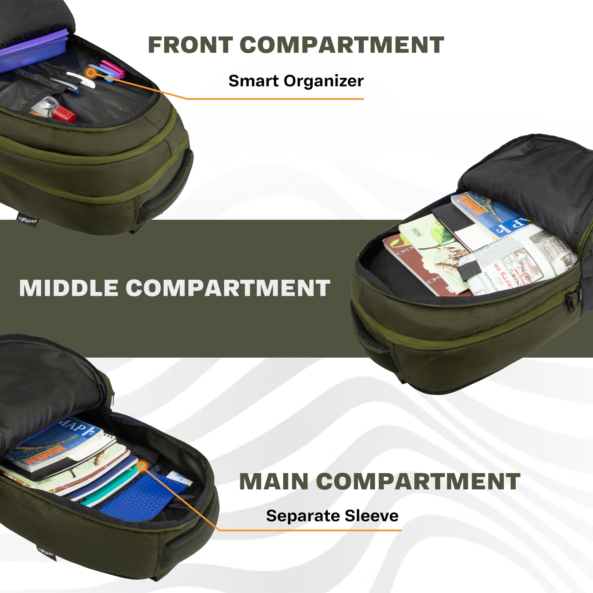 - COMPARTMENTS & POCKET:(3 compartments + 1 easy access front pocket) Featuring 3rd compartment has separate sleeve for files and Documents. 1st compartment consists of an organizer.