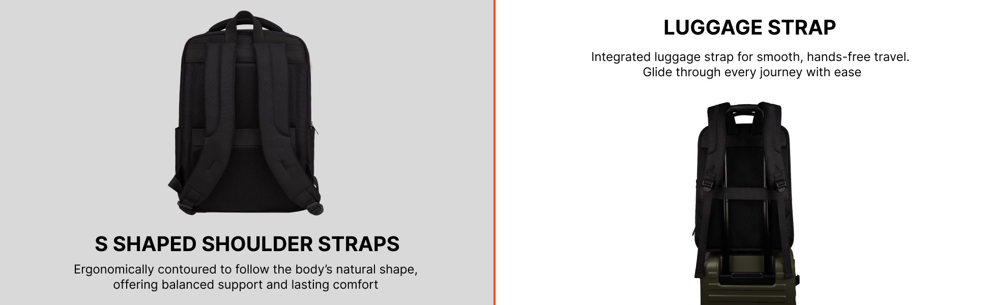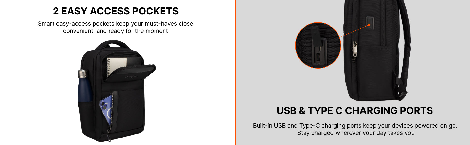 Weighing just 880 g and sized at 30 x 16 x 41 cm, it’s built for comfortable all-day carry. The USB & Type-C charging ports lets you power your devices on the go, while the luggage strap makes travel more convenient. Designed for daily use, it comes backed with a 1-year carry-in warranty for added peace of mind.
