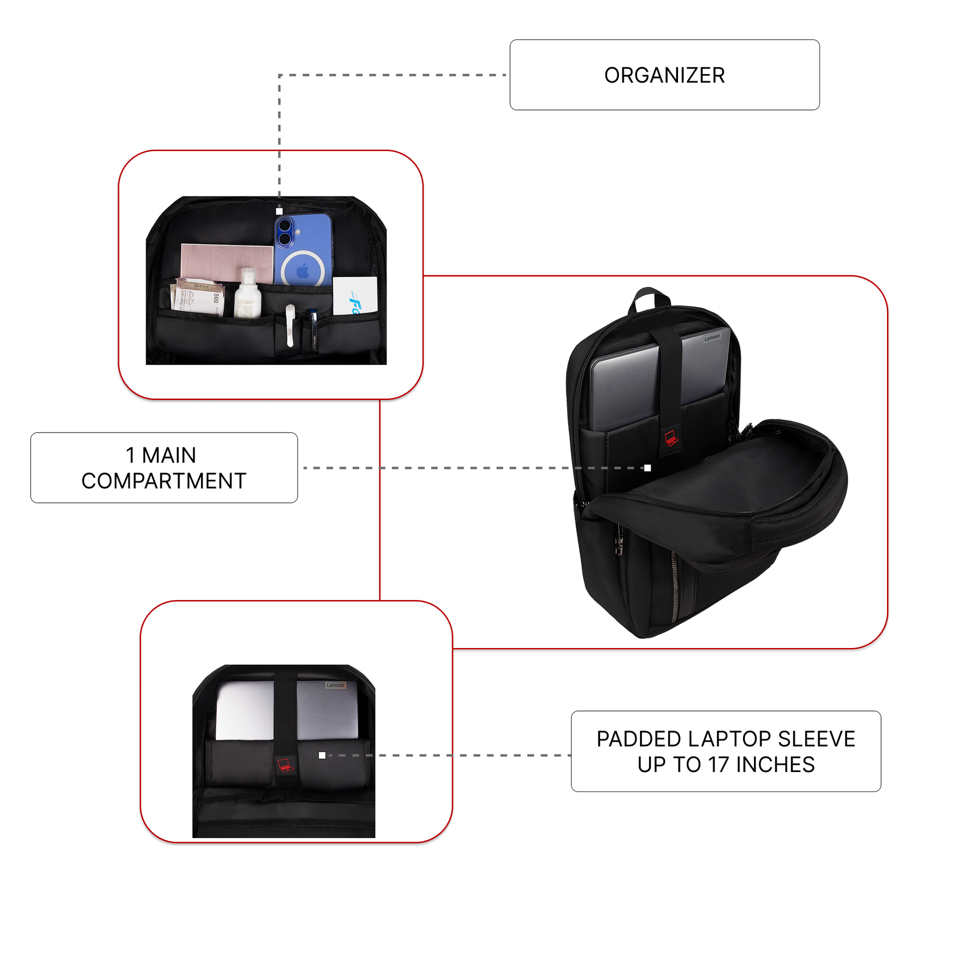 With a 19L capacity, the Kenton backpack features a smart internal setup with 3 compartments and 1 pocket, helping you stay organized throughout the day. It comfortably fits up to a 17” laptop and includes a dedicated tablet sleeve to keep your devices protected and easy to access.
