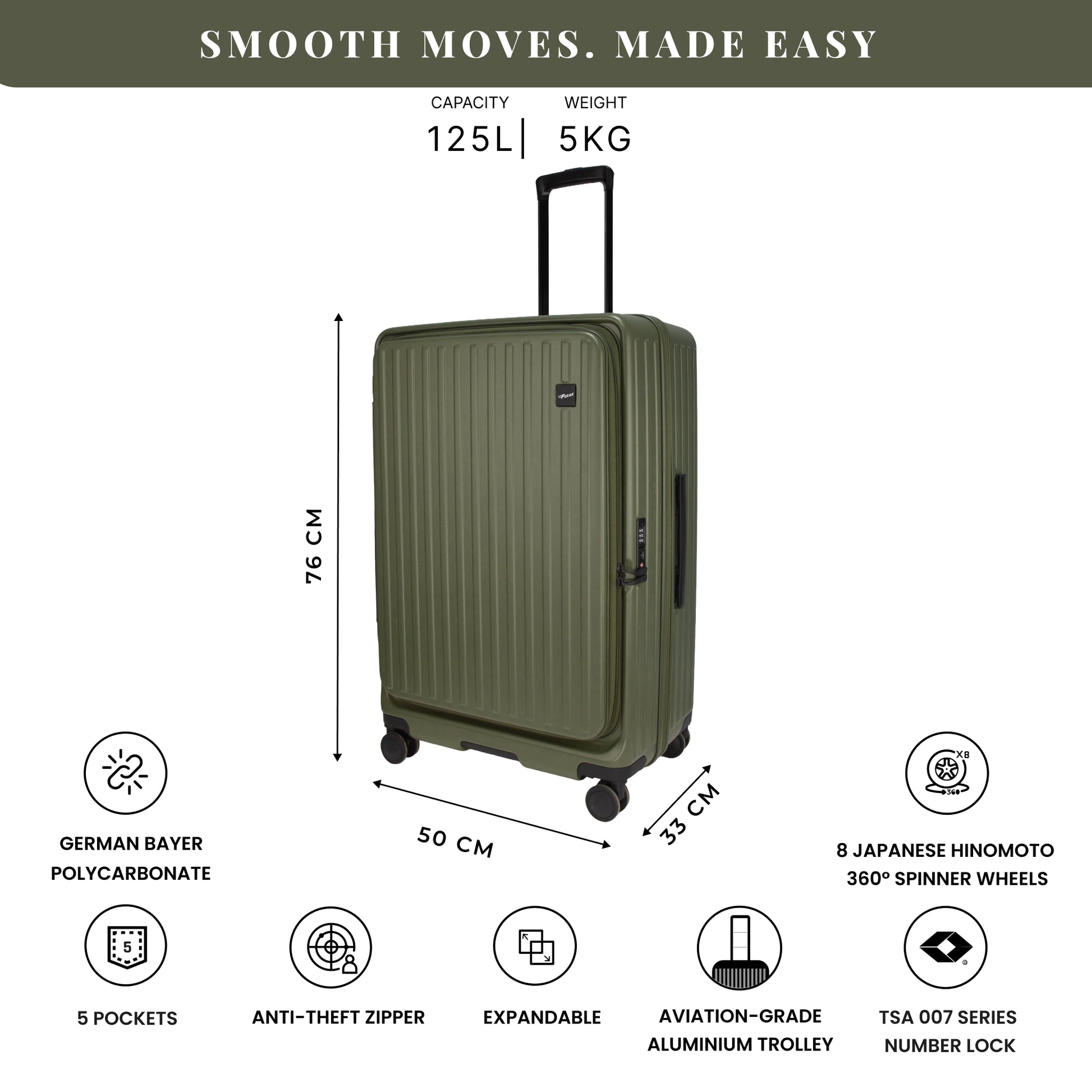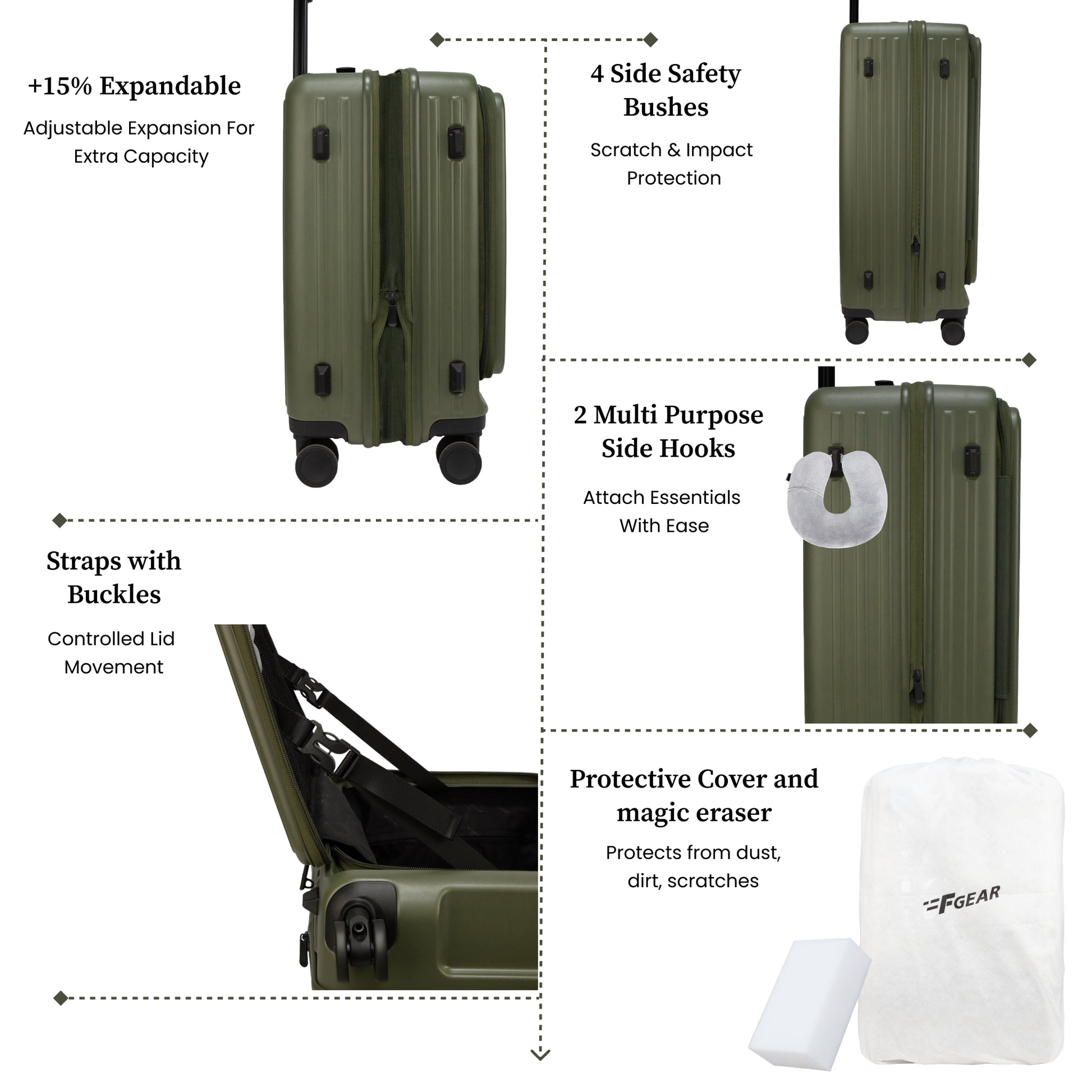 Travel with ease using the F Gear Montreal Large Strolley, front opening design built for extended trips. Made from German Makrolon Polycarbonate, it offers excellent impact resistance while weighing 5 kg. Equipped with 8 Japanese Hinomoto silent 360 degree spinner wheels & an Aviation-grade Aluminium trolley for effortless handling. Security comes from a TSA-approved 007 series lock and 2-layer Anti-theft Zipper, while convenience is enhanced with 4 safety bushes & 2 multipurpose hooks. With a 125L capacity and dimensions of 50 × 33 × 76 cm, two handles and internal adjustable straps, the F Gear Montreal Large Strolley is ideal for long trips. Thoughtful organisation includes 5 pockets including 1 wet pocket, and it comes with a protective cover and magic eraser.