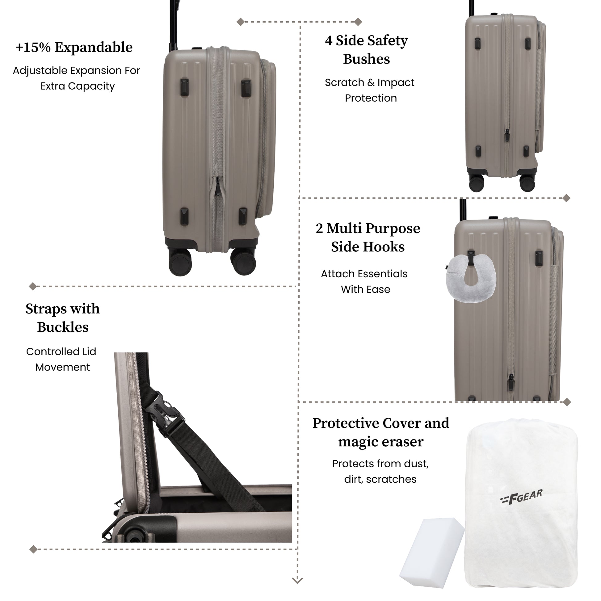 Travel with ease using the F Gear Montreal Large Strolley, front opening design built for extended trips. Made from German Makrolon Polycarbonate, it offers excellent impact resistance while weighing 5 kg. Equipped with 8 Japanese Hinomoto silent 360 degree spinner wheels & an Aviation-grade Aluminium trolley for effortless handling. Security comes from a TSA-approved 007 series lock and 2-layer Anti-theft Zipper, while convenience is enhanced with 4 safety bushes & 2 multipurpose hooks. With a 125L capacity and dimensions of 50 × 33 × 76 cm, two handles and internal adjustable straps, the F Gear Montreal Large Strolley is ideal for long trips. Thoughtful organisation includes 5 pockets including 1 wet pocket, and it comes with a protective cover and magic eraser.
