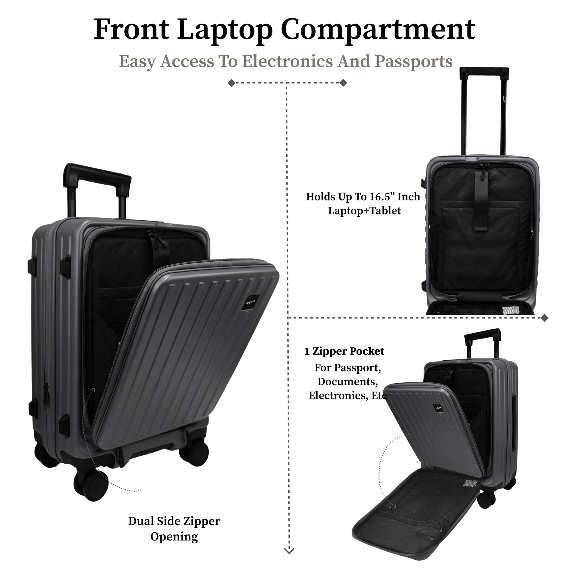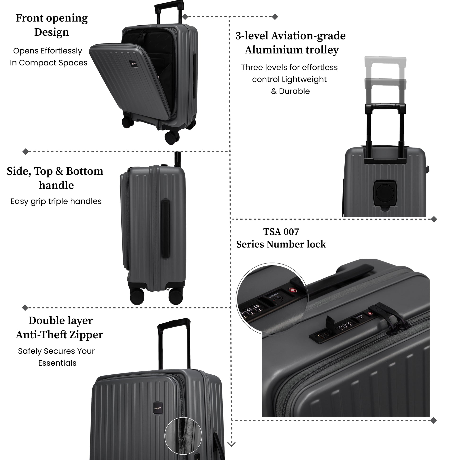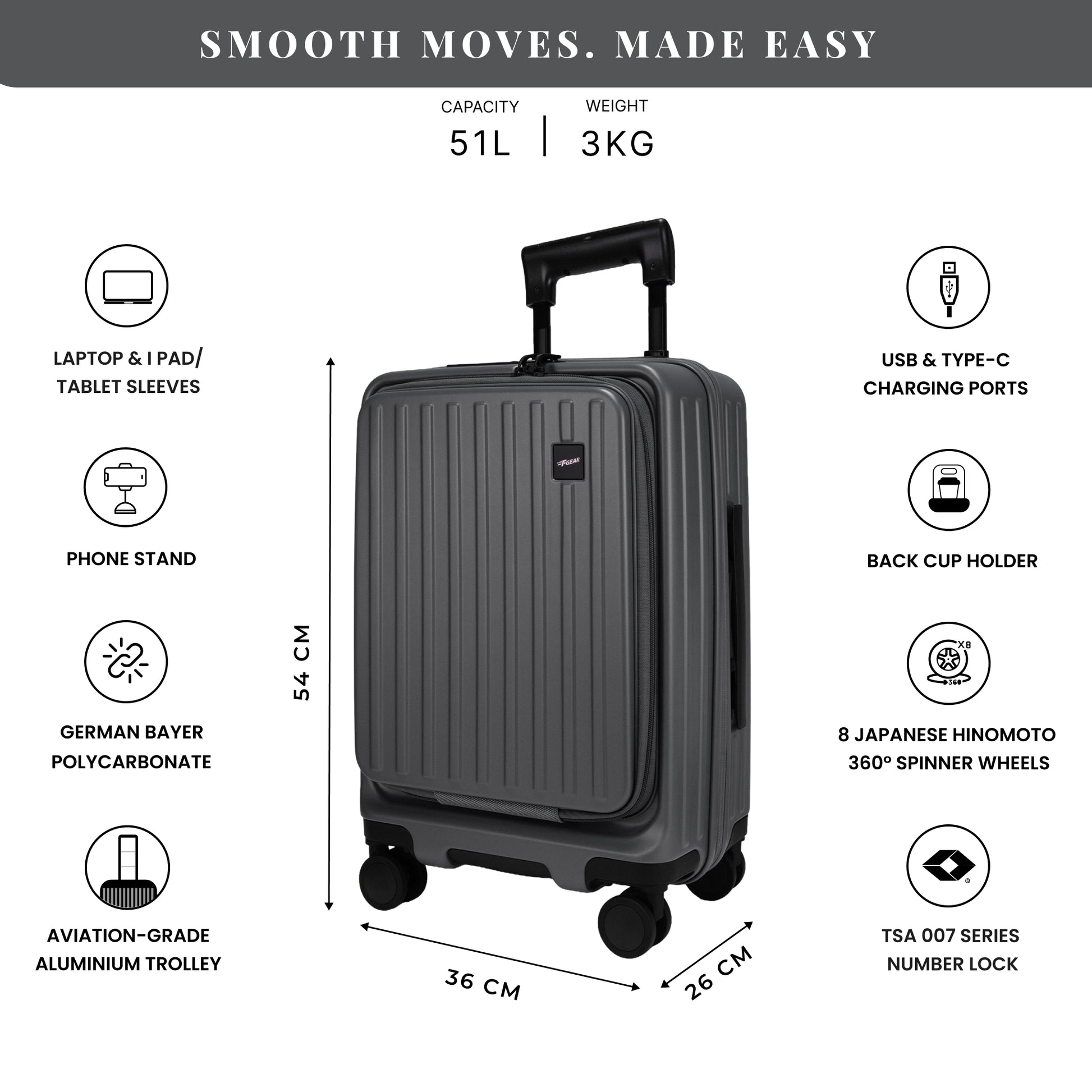 F Gear Montreal Small Cabin Pro Strolley is built for modern, fast-moving travellers who want smart features without extra bulk. Front Opening design, Crafted from German Makrolon Polycarbonate, it offers excellent impact resistance while staying lightweight at just 3.41 kg, making every trip easier and more comfortable. Designed with Japanese Hinomoto wheels, this strolley delivers a smooth 360° glide in all directions while staying super silent with minimal effort. Smart utilities like USB & Type-C charging ports, a back cup holder, and a phone stand keep essentials accessible on the move. The Aviation-grade Aluminium 3-level trolley adds strength and stability for long-term use across airports, stations, and city streets while keeping the strolley lightweight. Inside, it features a padded laptop sleeve and a dedicated tablet sleeve, ensuring your devices stay protected and organized. 3 internal pockets help neatly store accessories, documents, and travel essentials for clutter-free packing. Security is taken care of with the TSA-approved 007 series lock and 2-layer Anti-theft Zipper and 4 safety bushes, while the 2 multipurpose hooks make hands-free travel effortless. With a 51L capacity, +15% expandable zipper, and dimensions of 36 × 26 × 54 cm, the F Gear Montreal is ideal for short trips and cabin travel. The Montreal Cabin Pro also includes a protective cover and magic eraser for added convenience.
