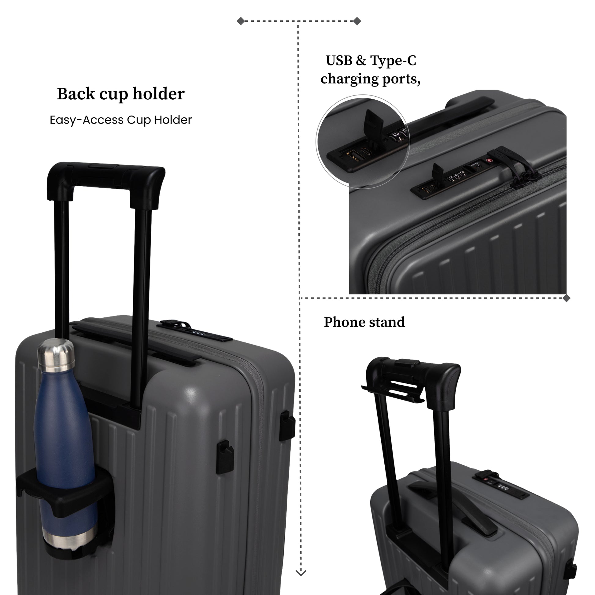- Smart Utilities on the Go – USB & Type-C charging ports, cup holder, phone stand, 4 safety bushes and 2 multipurpose hooks for easy, hands-free travel