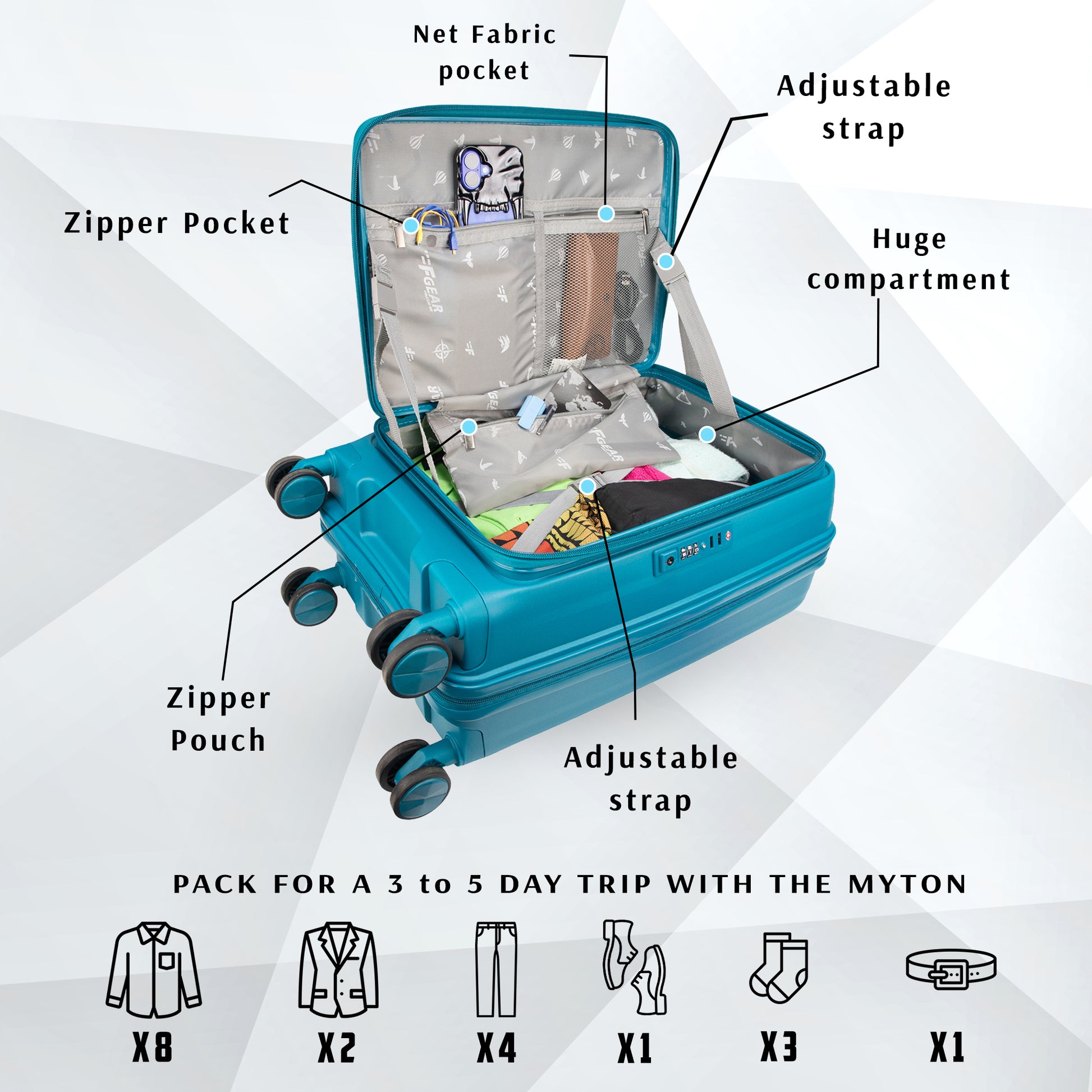 Travel smarter with the F Gear Myton Hard case luggage, a perfect blend of flexibility, durability, and effortless mobility. this front opening suitcase is designed to adapt—fitting into tighter spaces, allowing a little extra packing, and expanding whenever you need more room. Manoeuvring is a breeze with its 360° rotational 8-wheel system, engineered with silent spinner wheels for smooth and noise-free gliding across airports and city streets. Comfort is built into every detail: a durable telescopic trolley handle with 3 adjustable levels ensures perfect height adjustment, while sturdy top handles make lifting and carrying convenient. For peace of mind, the F Gear Myton comes equipped with a built-in TSA approved lock and a tamper-proof anti-theft zipper, ensuring your belongings stay secure throughout your journey. Reinforced corners and strong stitching add long-lasting resilience, making it reliable trip after trip. Whether for business, leisure, or family travel, the F Gear Myton is designed to be your trusted travel companion with 3 years carry in warranty for manufacturing defects.