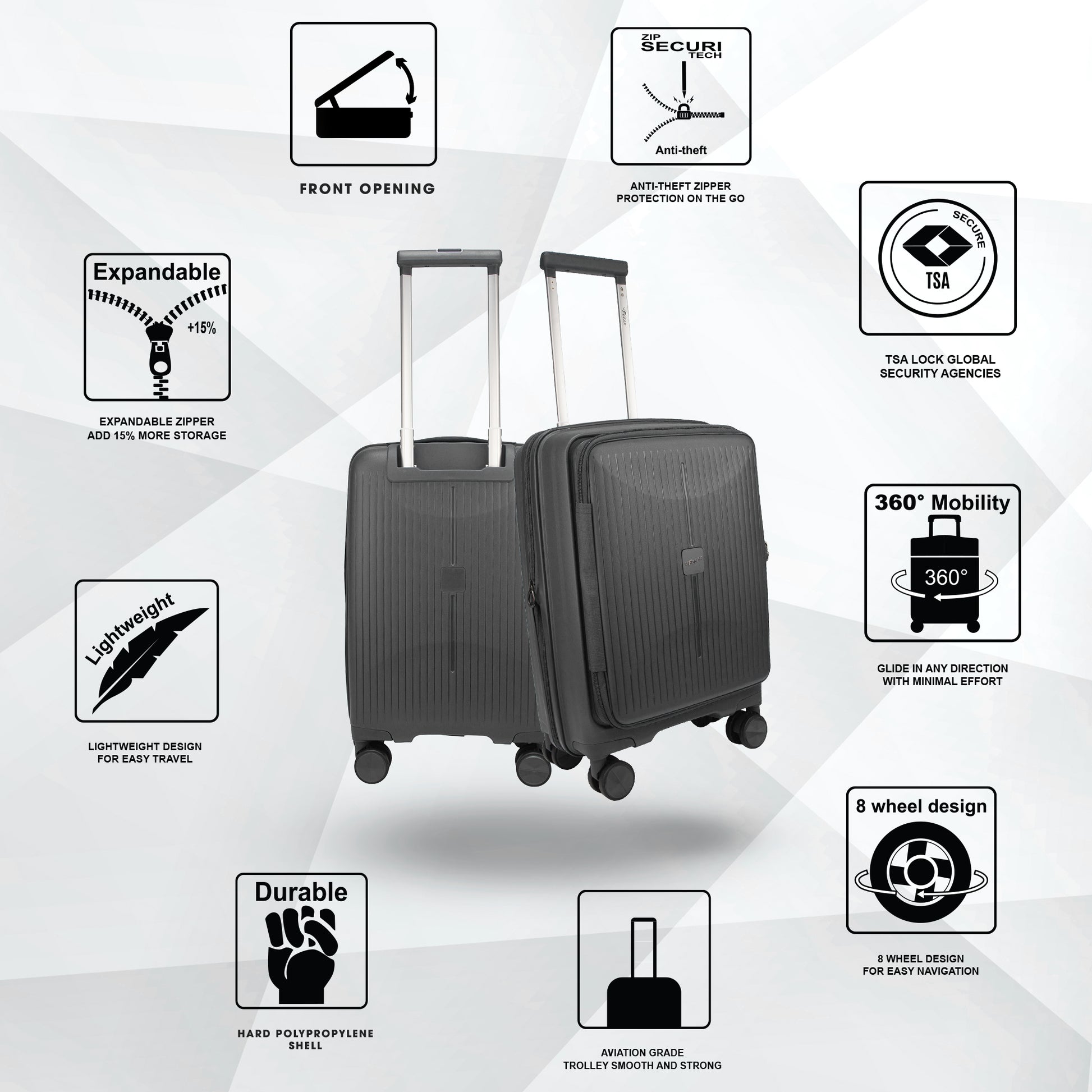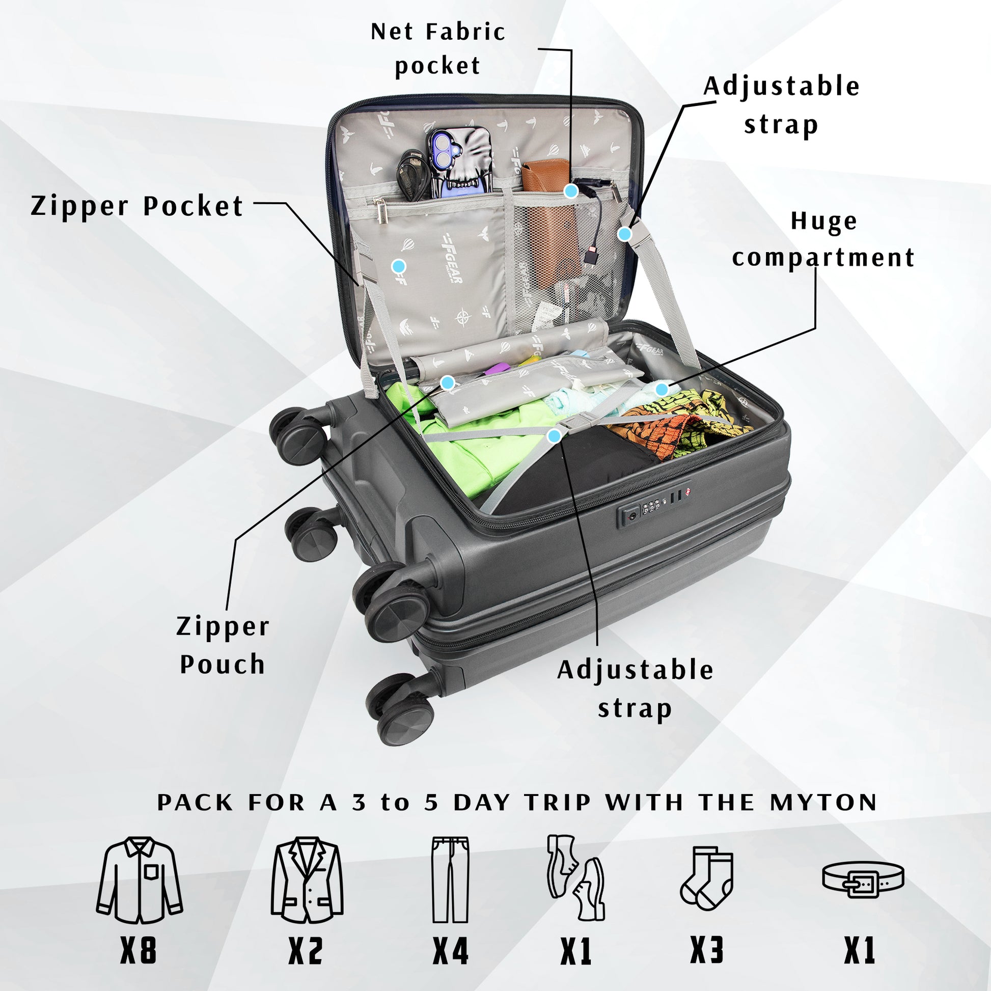 Travel smarter with the F Gear Myton Hard case luggage, a perfect blend of flexibility, durability, and effortless mobility. this front opening suitcase is designed to adapt—fitting into tighter spaces, allowing a little extra packing, and expanding whenever you need more room. Maneuvering is a breeze with its 360° rotational 8-wheel system, engineered with silent spinner wheels for smooth and noise-free gliding across airports and city streets. Comfort is built into every detail: a durable telescopic trolley handle with 3 adjustable levels ensures perfect height adjustment, while sturdy top handles make lifting and carrying convenient. For peace of mind, the F Gear Myton comes equipped with a built-in TSA approved lock and a tamper-proof anti-theft zipper, ensuring your belongings stay secure throughout your journey. Reinforced corners and strong stitching add long-lasting resilience, making it reliable trip after trip. Whether for business, leisure, or family travel, the F Gear Myton is designed to be your trusted travel companion with 3 years carry in warranty for manufacturing defects.