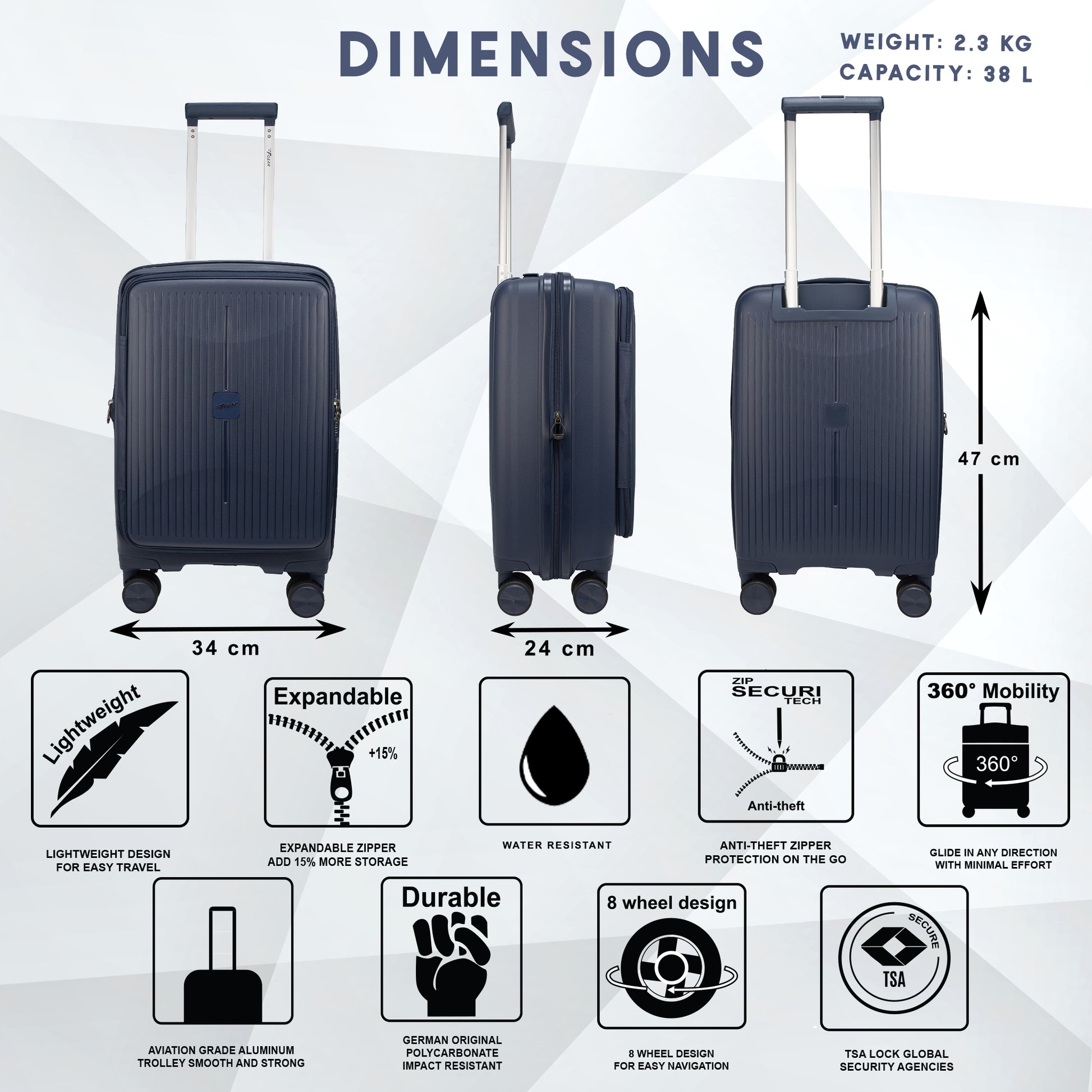 Travel smarter with the F Gear Myton Hard case luggage, a perfect blend of flexibility, durability, and effortless mobility. this front opening suitcase is designed to adapt—fitting into tighter spaces, allowing a little extra packing, and expanding whenever you need more room. Maneuvering is a breeze with its 360° rotational 8-wheel system, engineered with silent spinner wheels for smooth and noise-free gliding across airports and city streets. Comfort is built into every detail: a durable telescopic trolley handle with 3 adjustable levels ensures perfect height adjustment, while sturdy top handles make lifting and carrying convenient. For peace of mind, the F Gear Myton comes equipped with a built-in TSA approved lock and a tamper-proof anti-theft zipper, ensuring your belongings stay secure throughout your journey. Reinforced corners and strong stitching add long-lasting resilience, making it reliable trip after trip. Whether for business, leisure, or family travel, the F Gear Myton is designed to be your trusted travel companion with 3 years carry in warranty for manufacturing defects.