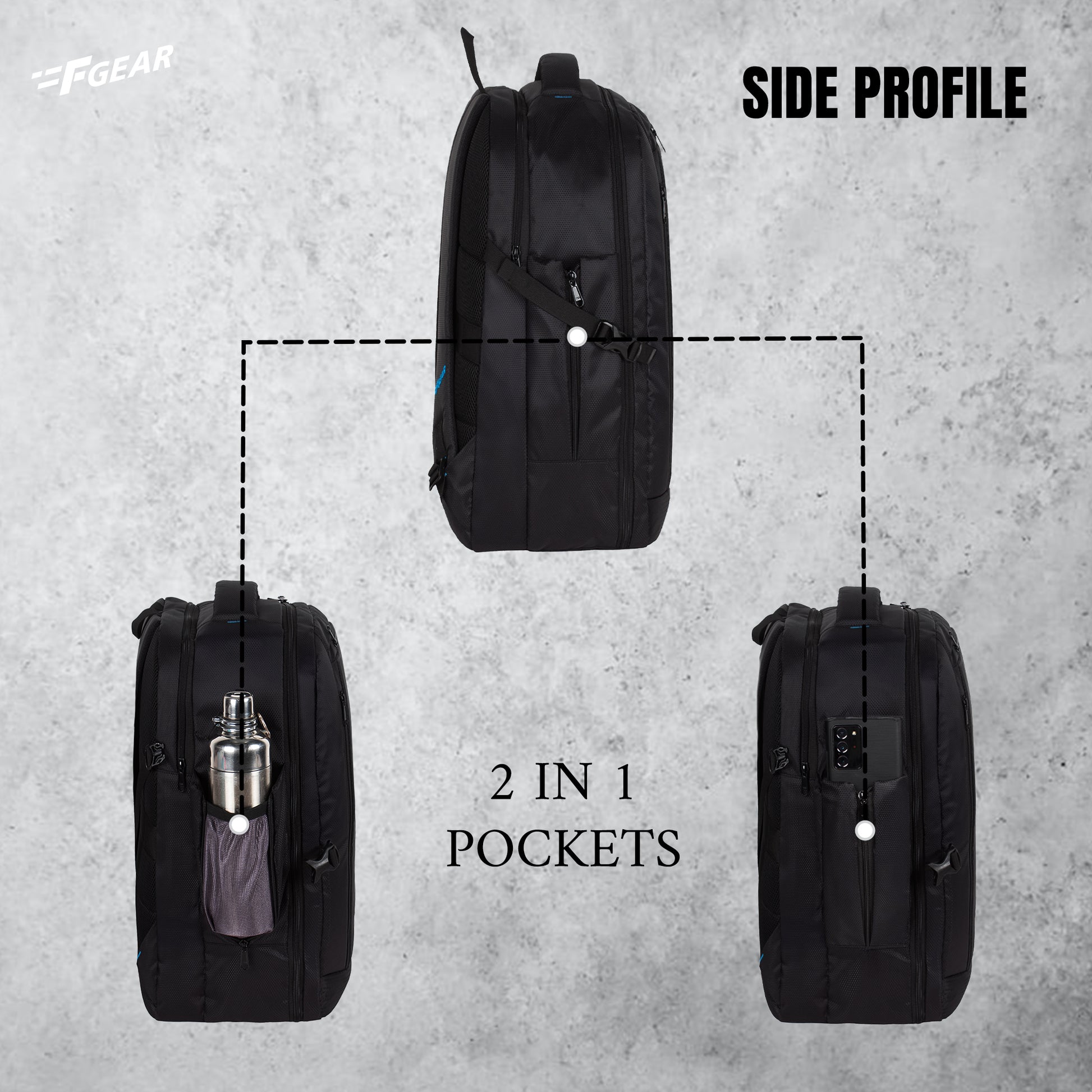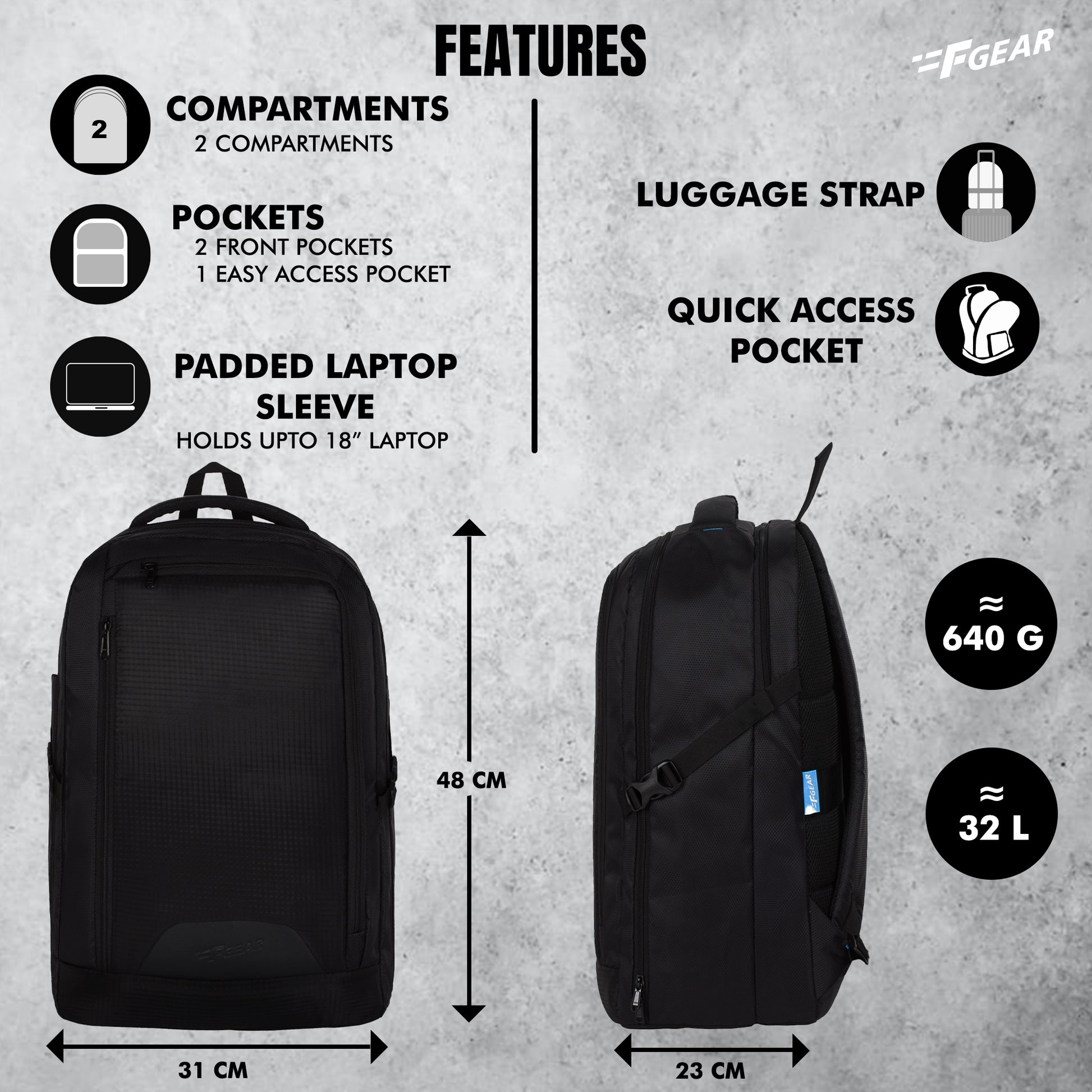This F Gear Nighthawk laptop backpack, the bag is thoughtfully designed with two ways of opening. The 180-degree opening makes everything visible at a glance. Features 2 huge compartments with laptop sleeve and organizer, 2 front pockets and a zip pocket, apart from this it has one zip mesh bottle holders. Air mesh padding at the back panel and shoulder straps for utmost comfort. This has the world's best YKK zippers and sliders. To describe it briefly here are the following points: 1. This backpack is made of durable polyester fabric and is treated to make it water-resistant. 2. The capacity of the bag is 33L. 3. This backpack comes with 2 large main zippered compartments. 4. The last compartment has a Laptop sleeve compatible for 17” Laptop. 5. The second compartment is the biggest one. It can open 180 degrees with everything visible in one glance. This is huge and can also be used as an overnighter. 6. There are two zippered pockets in the front. Both these pockets are really huge and padded on both sides. They can be used for keeping electronics such as iPad etc. 7. The back zippered pocket also has an organizer to organize all the stationery. 8. The front zippered pocket can be used for keeping files and folders. 9. It has a collapsible water bottle pouch. When zippered this can be used for mobile and when open it can be used for water bottle. 10. It has adjusters at both sides for snug fit which adds to weight management. 11. It has a suitcase strap at the back and easily be attached to any trolley case when travelling. 12.. This backpack is equipped with padded adjustable shoulder straps for extra comfort. 13. Apart from this it has world’s best YKK zippers and sliders. 14. Suitable for College, Office, Tuitions and Travel. 15. Comes with the F Gear promise of quality and durability.