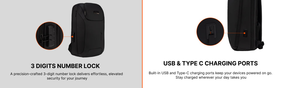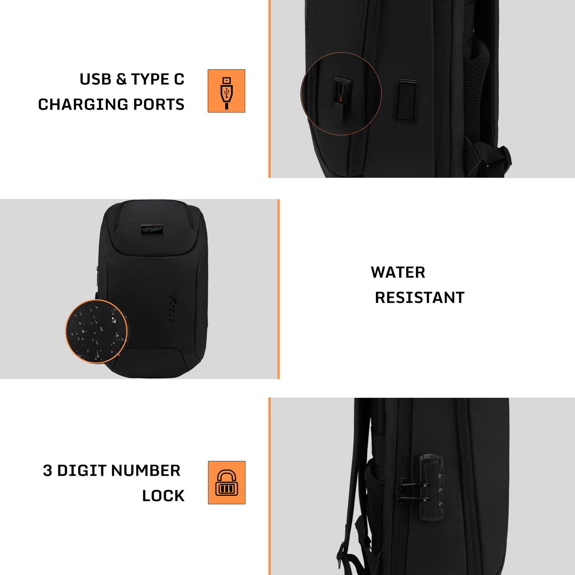 The F Gear Phantom Premium Black Laptop Backpack is designed for those who seek performance, protection, and modern styling in one. With a 30L capacity, it includes 1 large compartments and 4 utility pockets, perfectly suited for carrying a 17-inch laptop, books, gadgets, and accessories. The USB and Type C charging ports keep your devices powered up, while the number lock and hidden back pocket add reliable anti-theft protection. Its 180° flat opening allows convenient packing and quick access to all essentials. Crafted from premium water-resistant material, it’s built to withstand daily wear and weather. The ergonomic padded back panel and soft shoulder straps ensure lasting comfort through long commutes or travels. It also features a luggage strap for trolley attachment. Dimensions: 31 x 19 x 45 cm Weight 1160 G. Backed by a 1-year carry-in warranty from F Gear for assured quality and durability.