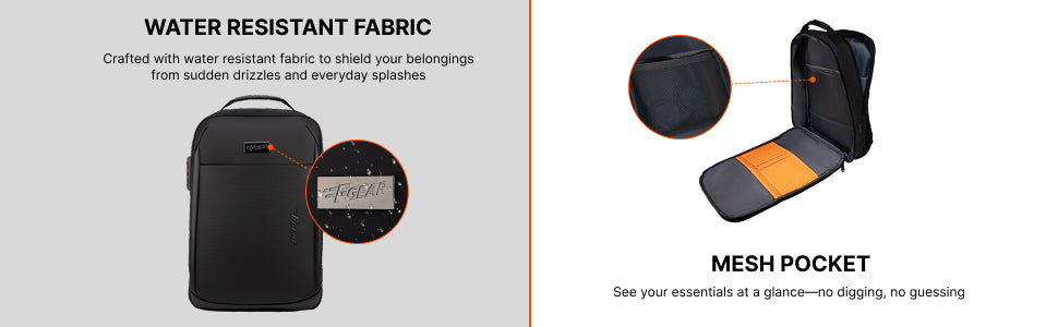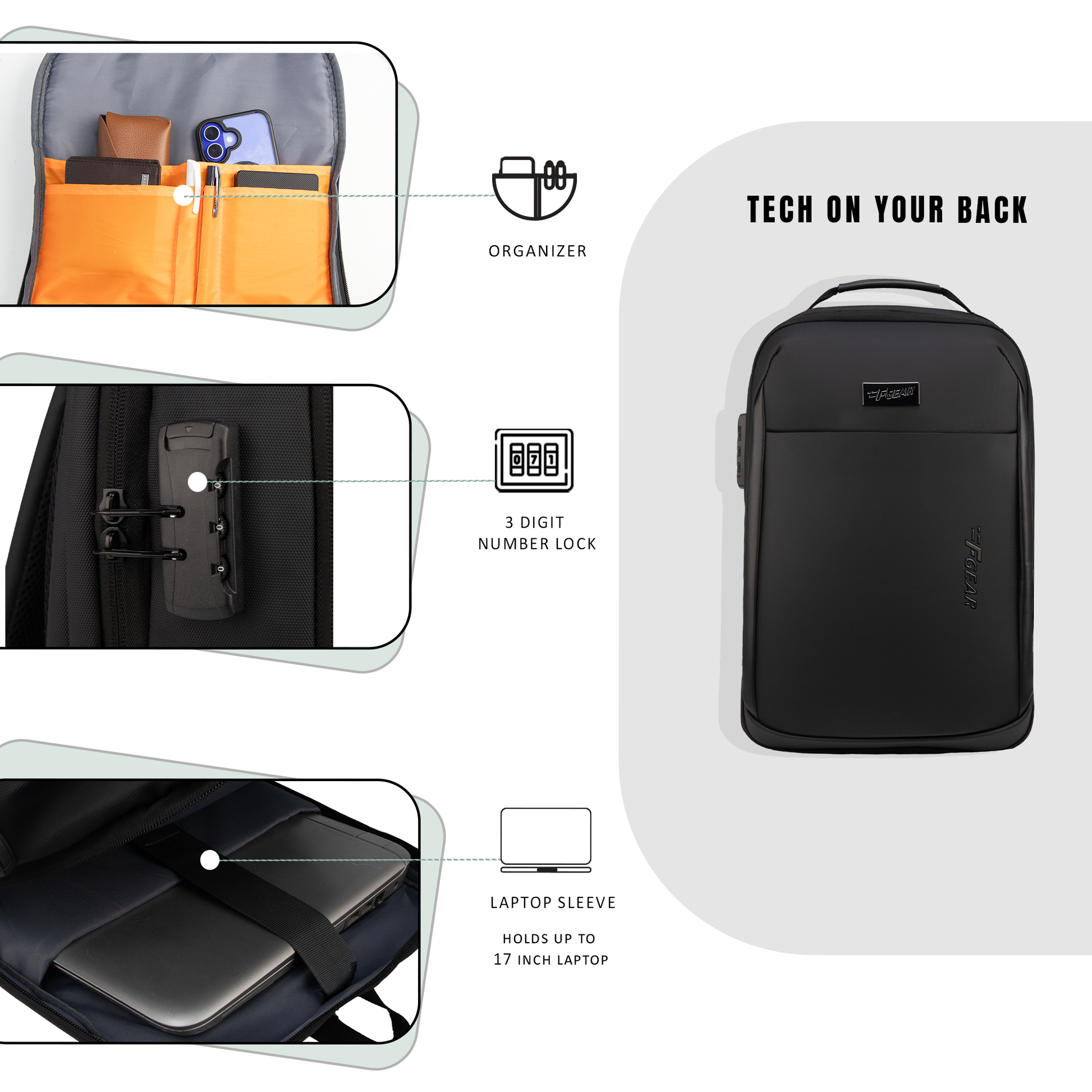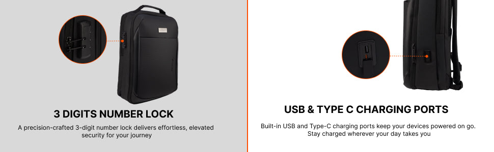 The F Gear Phoenyx Premium Black Laptop Backpack blends modern design with practical organization, making it perfect for men and women on the move. Offering a 24L capacity, it features 2 spacious compartments and 2 utility pockets, keeping your essentials neatly arranged. The USB and Type C charging ports enable easy device charging on the go, while the number lock and hidden back pocket provide anti-theft security. With a 180° full-opening design, you can pack and access items effortlessly. Built from premium water-resistant material, the Phoenyx ensures long-lasting performance and protection in all conditions. The ergonomic padded back panel and cushioned shoulder straps deliver all-day comfort, while the luggage strap makes travel seamless. Dimensions: 31 x 17 x 45 cm Weight 1150 G. Comes with a 1-year carry-in warranty from F Gear for dependable support and peace of mind.