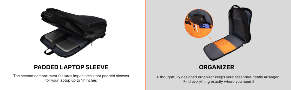 Includes 2 spacious compartments and 2 utility pockets, offering smart organization for a 17-inch laptop, books, and accessories. Designed with ergonomic padded back support and cushioned shoulder straps for maximum comfort. - Travel-Ready & Warranty Protected: