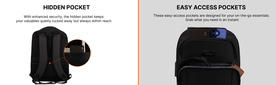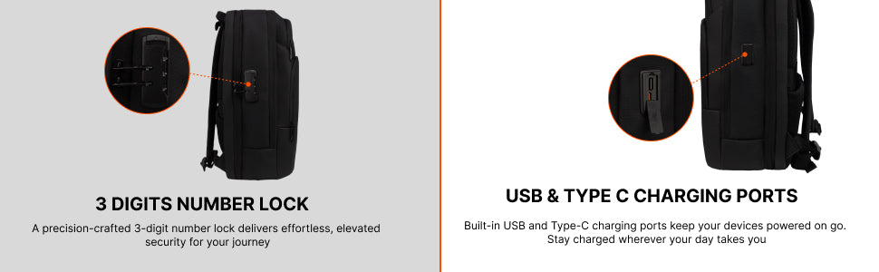 Equipped with USB and Type C charging ports, a number lock, and a hidden back pocket to keep your devices powered and valuables secure. -