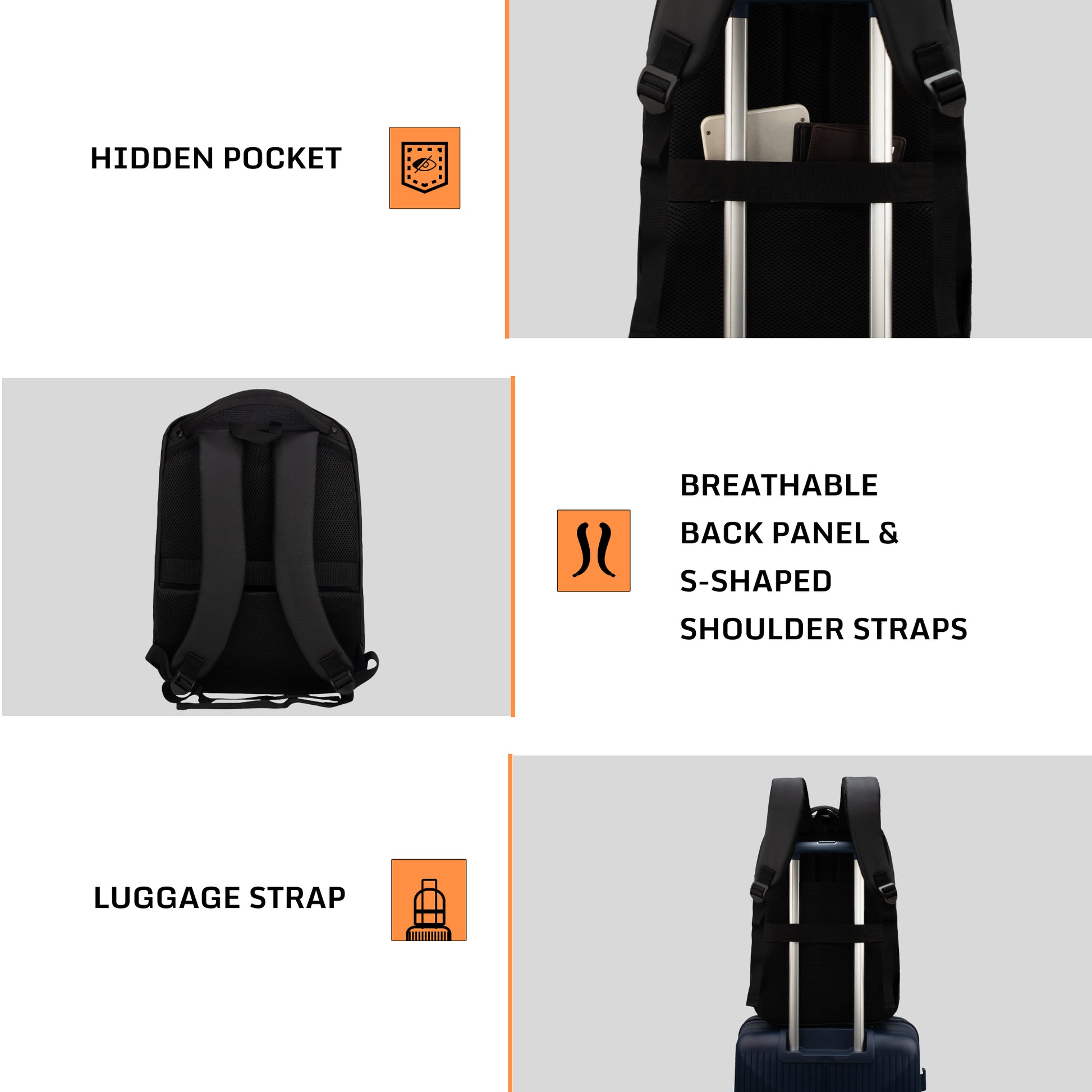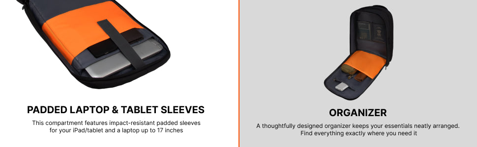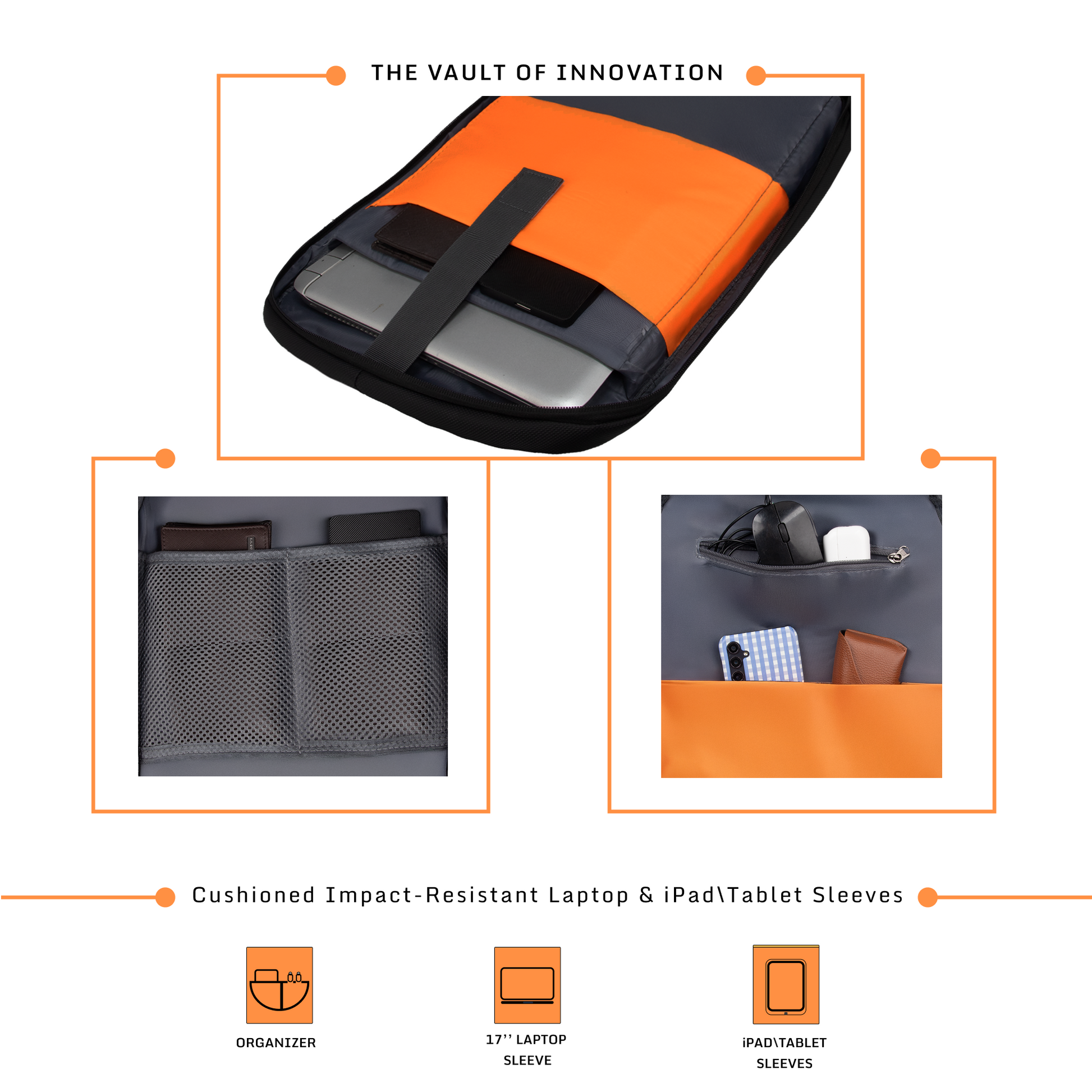 Comes with 2 large compartments and 3 utility pockets, offering well-structured space for a 17-inch laptop, tablet, accessories, and documents. -