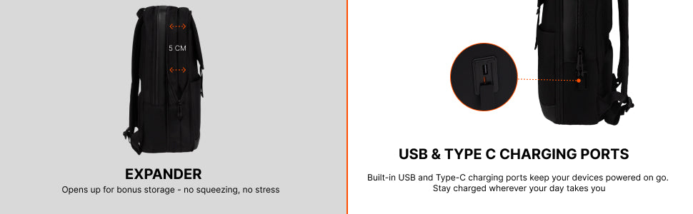 Comes with an in-built USB and Type C charging port, allowing you to conveniently charge your devices on the go without opening your bag. - Compact Yet Spacious (21L):