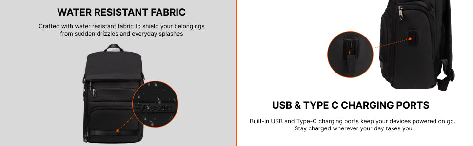 The F Gear Saber Premium Black Laptop Backpack is designed for men and women who want everyday comfort and functionality in a sleek profile. With a 23L capacity, it includes 2 spacious compartments and 5 utility pockets, making it perfect for carrying a 17-inch laptop, accessories, and daily essentials. Equipped with USB and Type C charging ports, you can easily charge your devices while on the go. Built from premium water-resistant material, this backpack ensures durability and protection in any weather. The ergonomic padded back panel and soft shoulder straps provide superior comfort during long commutes. It also includes a detachable key chain holder and a luggage strap for easy trolley attachment during travel. Dimensions: 30 x 17 x 45 cm Weight 1070 G. Backed by a 1-year carry-in warranty from F Gear for lasting reliability and peace of mind.