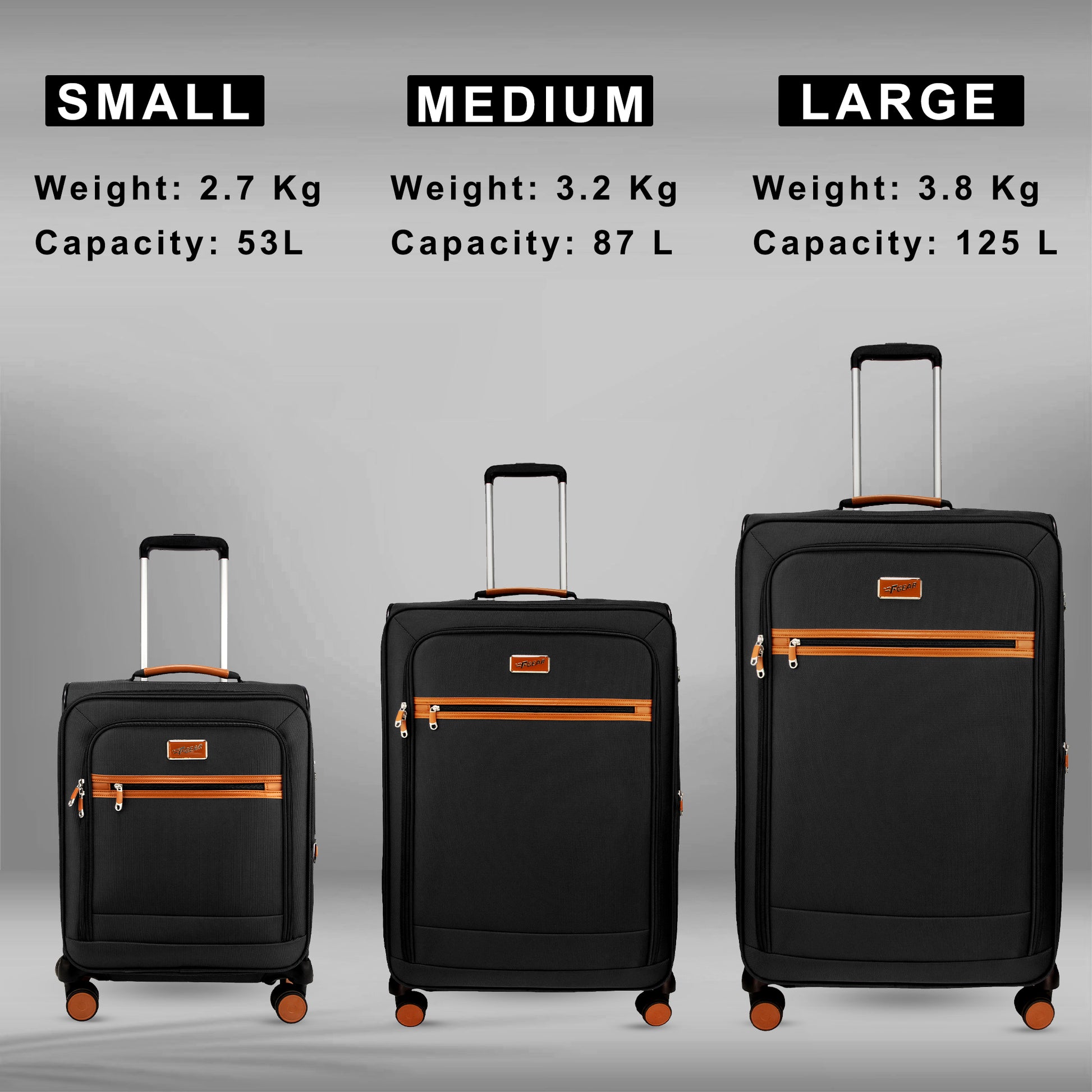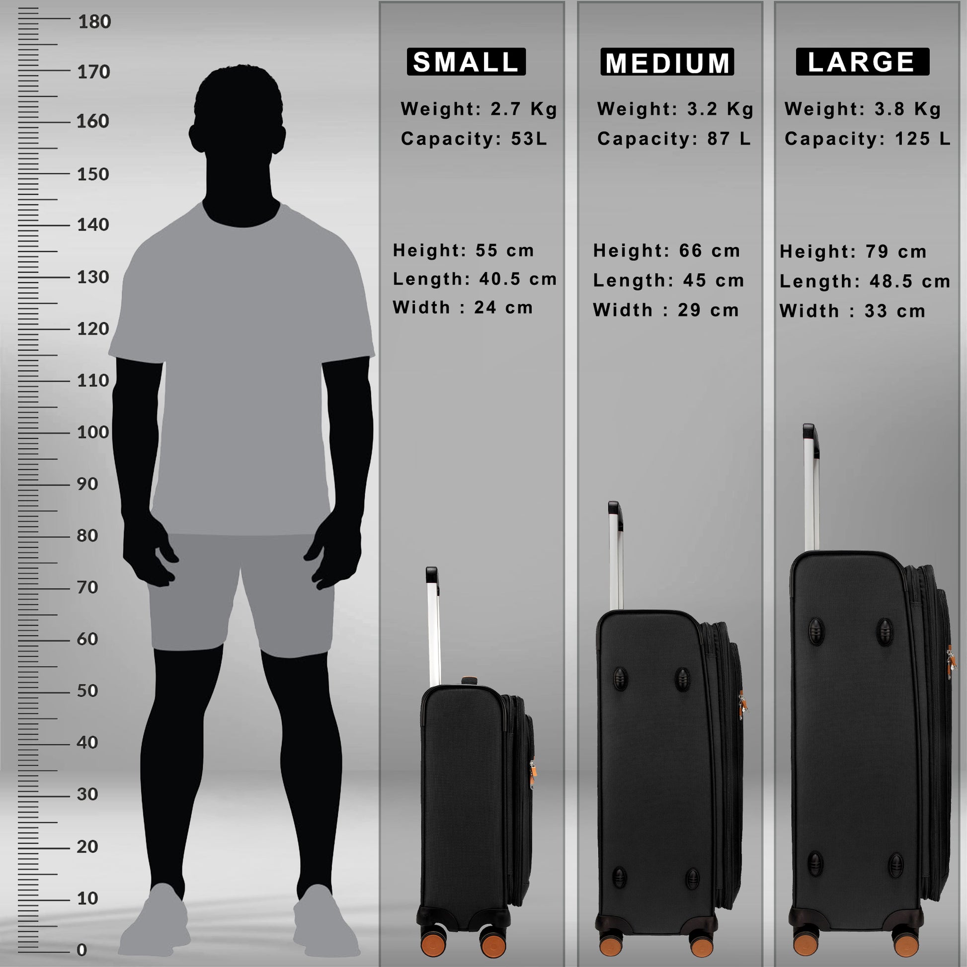 - Dimensions: 40.5 (L) x 24(W) x 55(H) cm. Weight 2.7 kg. Small Suitcase, capacity of 53L, 45 (L) x 29(W) x 66.5(H) cm. Weight 3.2 kg. Medium Suitcase, capacity of 86L, 48 (L) x 33(W) x 79(H) cm. Weight 3.8 kg. Large Suitcase, capacity of 125L,