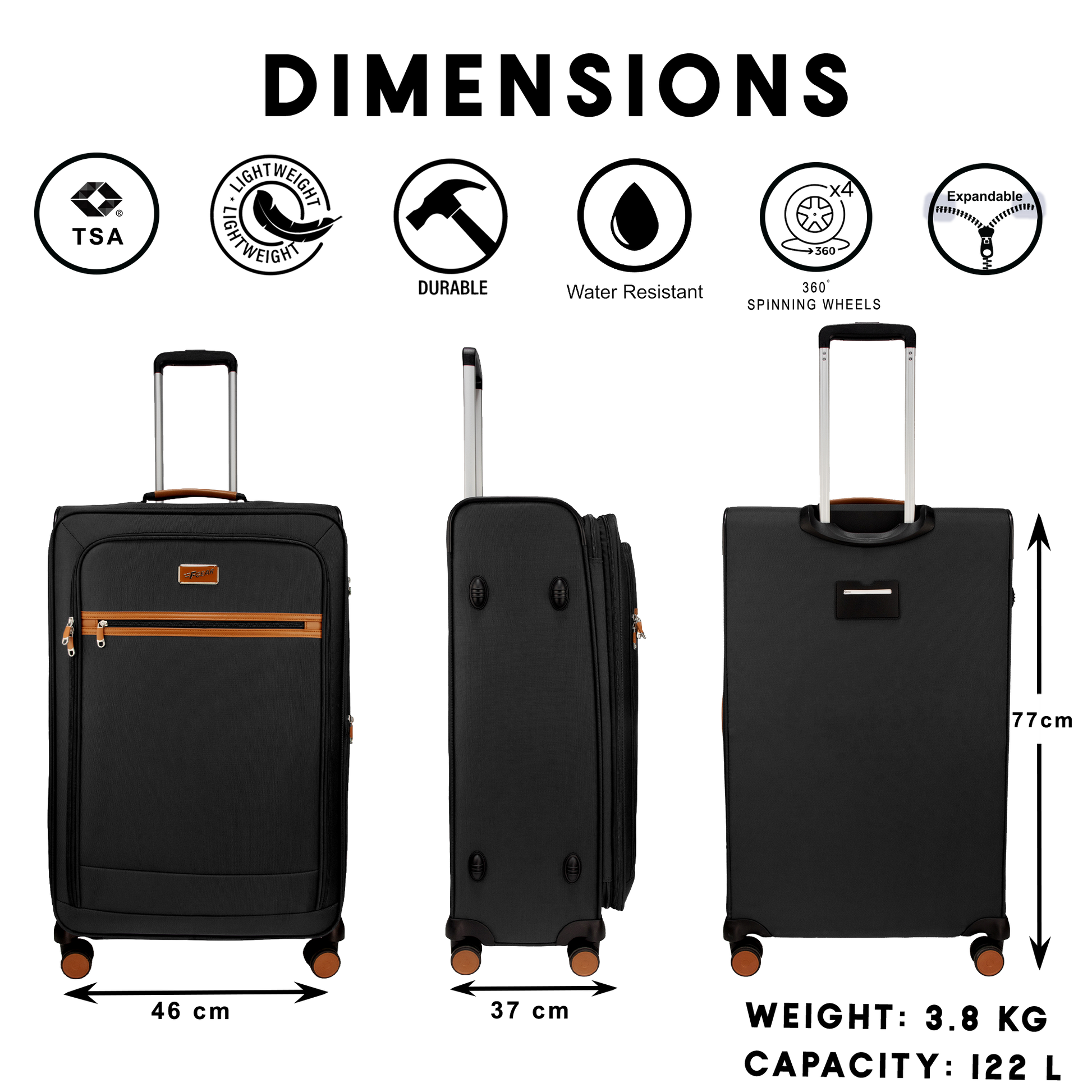 - Dimensions: 46 (L) x 37(W) x 77(H) cm. Weight 3.8 kg. Check-in Suitcase, capacity of 122L,