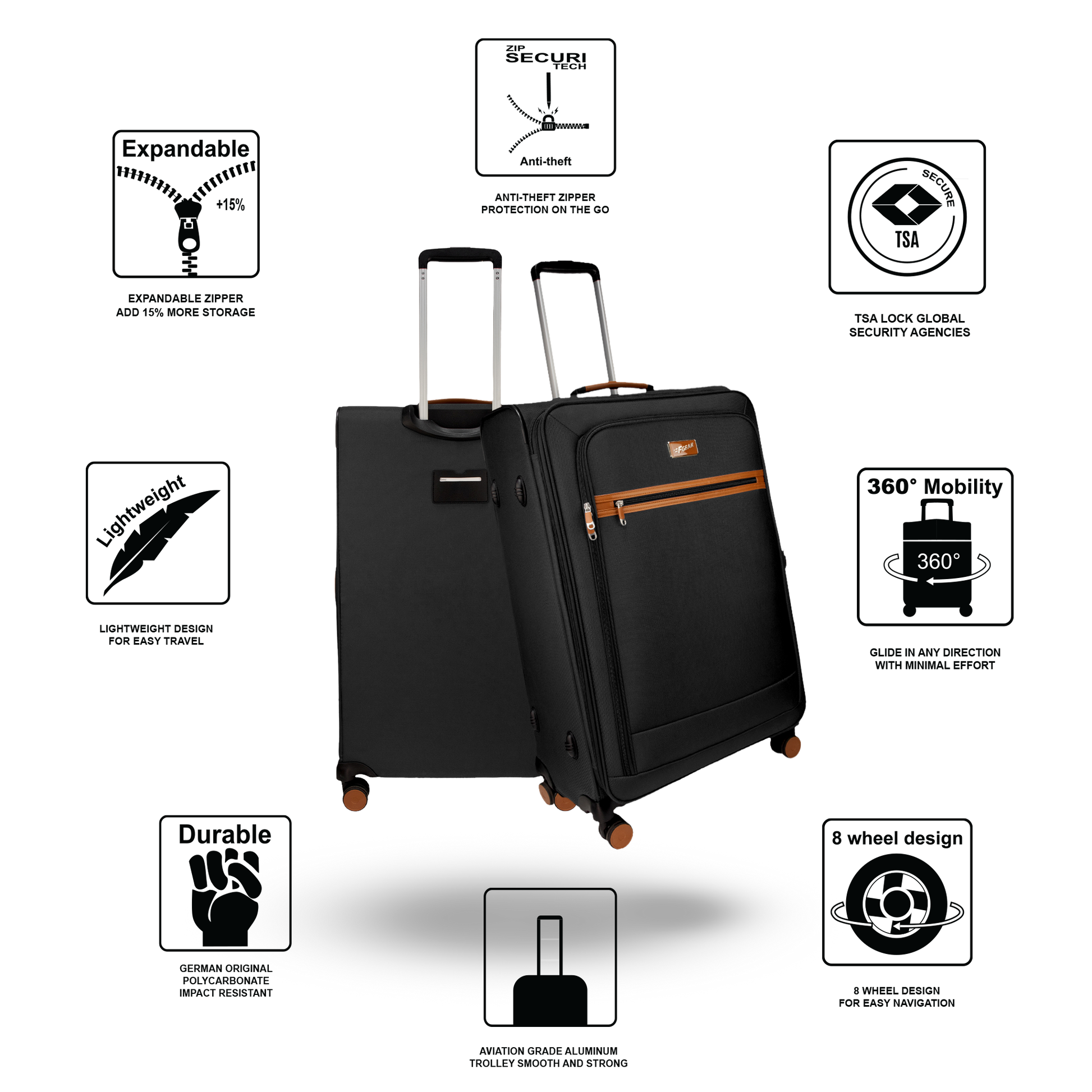 - 8-Wheel System: Double spinner wheels offer added stability and superior balance, ensuring the luggage stays upright and rolls smoothly even when fully packed.