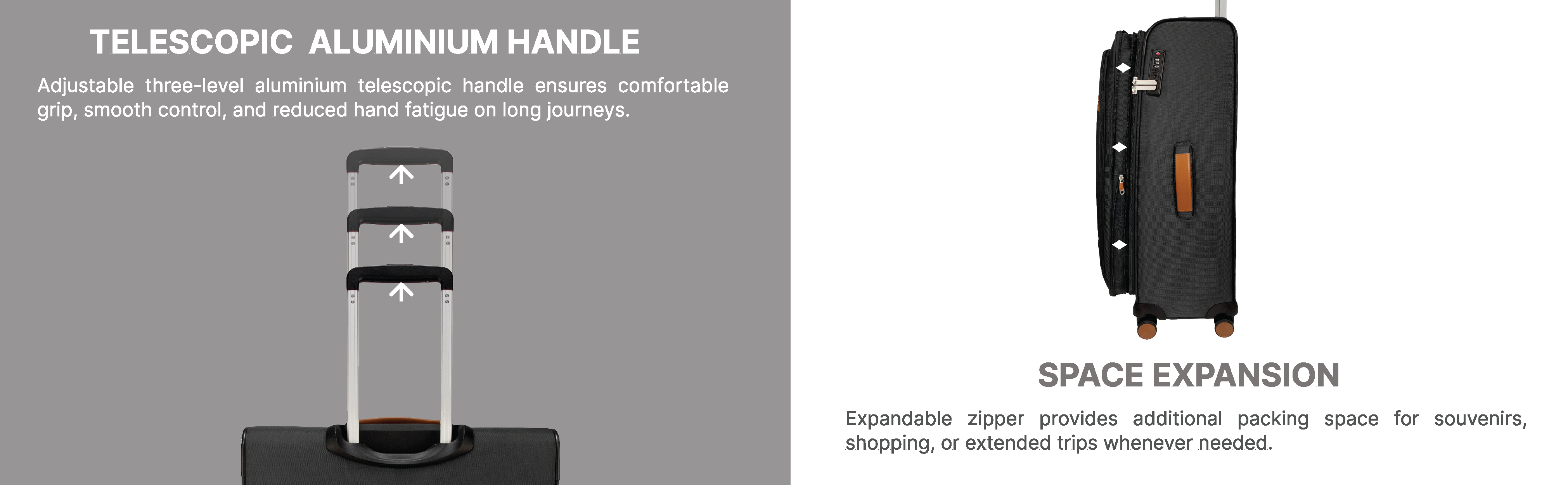 - Telescopic Handle (3 Levels): Adjustable to three different height levels, this telescopic handle ensures maximum comfort for travelers of different heights. Designed with a firm grip, it prevents hand fatigue during long hauls.