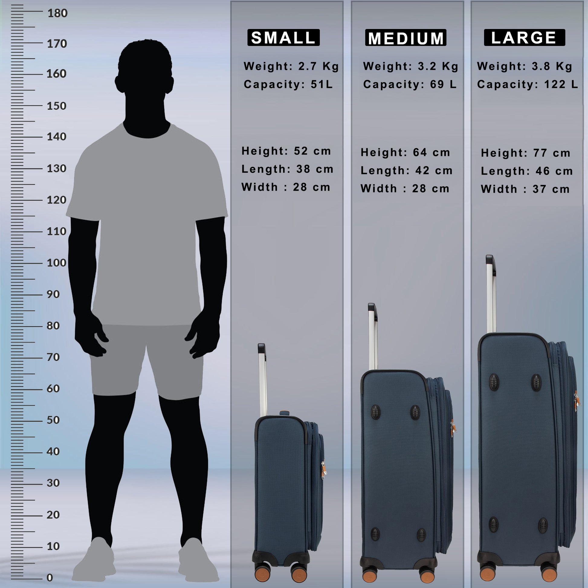 - Dimensions: 38 (L) x 28(W) x 52(H) cm. Weight 2.7 kg. Small Suitcase, capacity of 51L, 42 (L) x 28(W) x 64(H) cm. Weight 3.2 kg. Medium Suitcase, capacity of 69L, 46 (L) x 37(W) x 77(H) cm. Weight 3.8 kg. Large Suitcase, capacity of 122L,