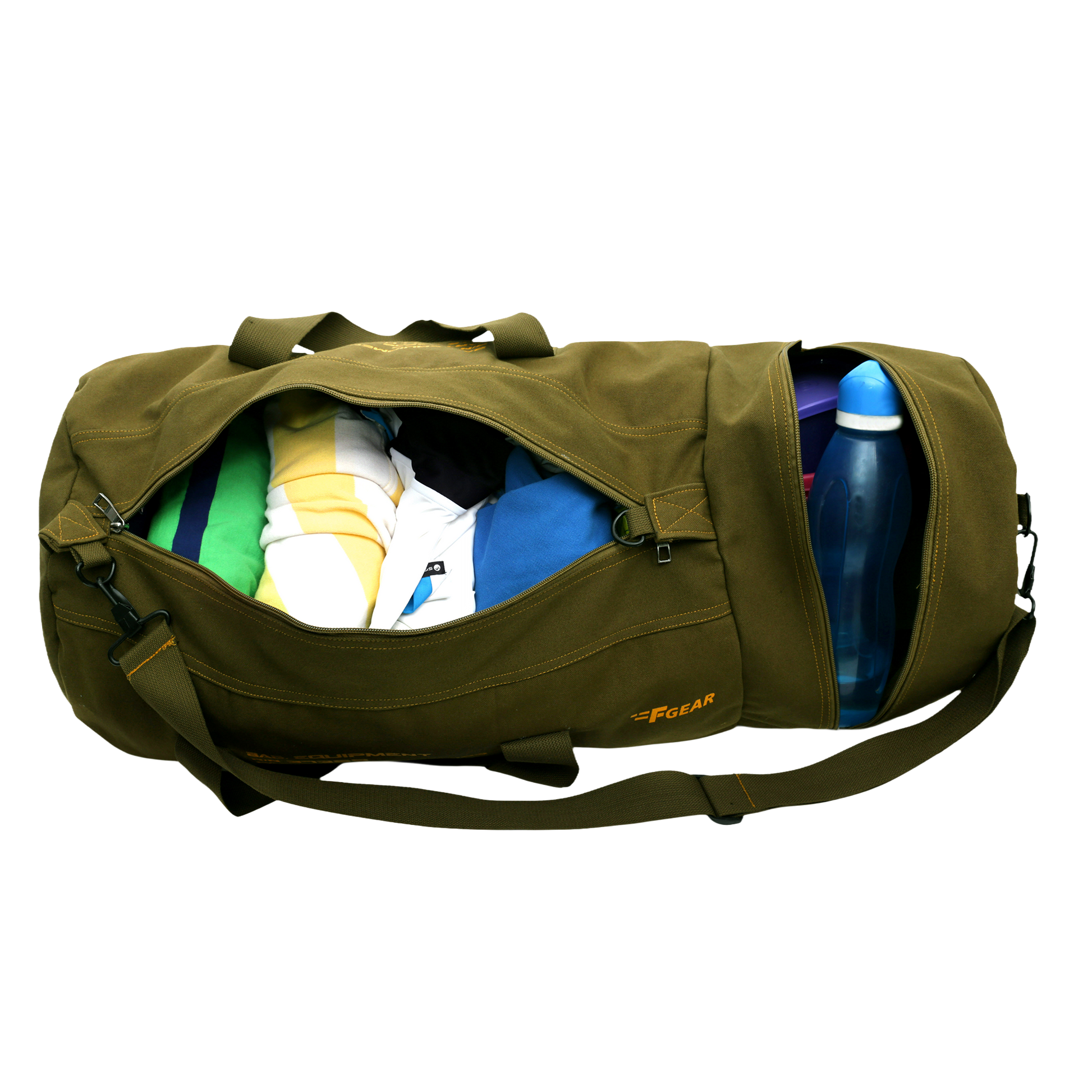 This F Gear Solider Waterproof Duffel bags can be used to carry luggage, sports equipment, people who travel in the outdoors, campers, hunters, weekends, getaways, and short trips etc. It has 3 total zippered pockets: 23" zipper main compartment, 7" extension end pocket and end zip pocket. Grab handle for easy carrying. When your arms get tired of holding the bag you can use the detachable and adjustable shoulder strap. Strap has a D ring connection closure. The bag is called the double ender because it features zipper pockets on both ends that offer easy access unlike other bags.