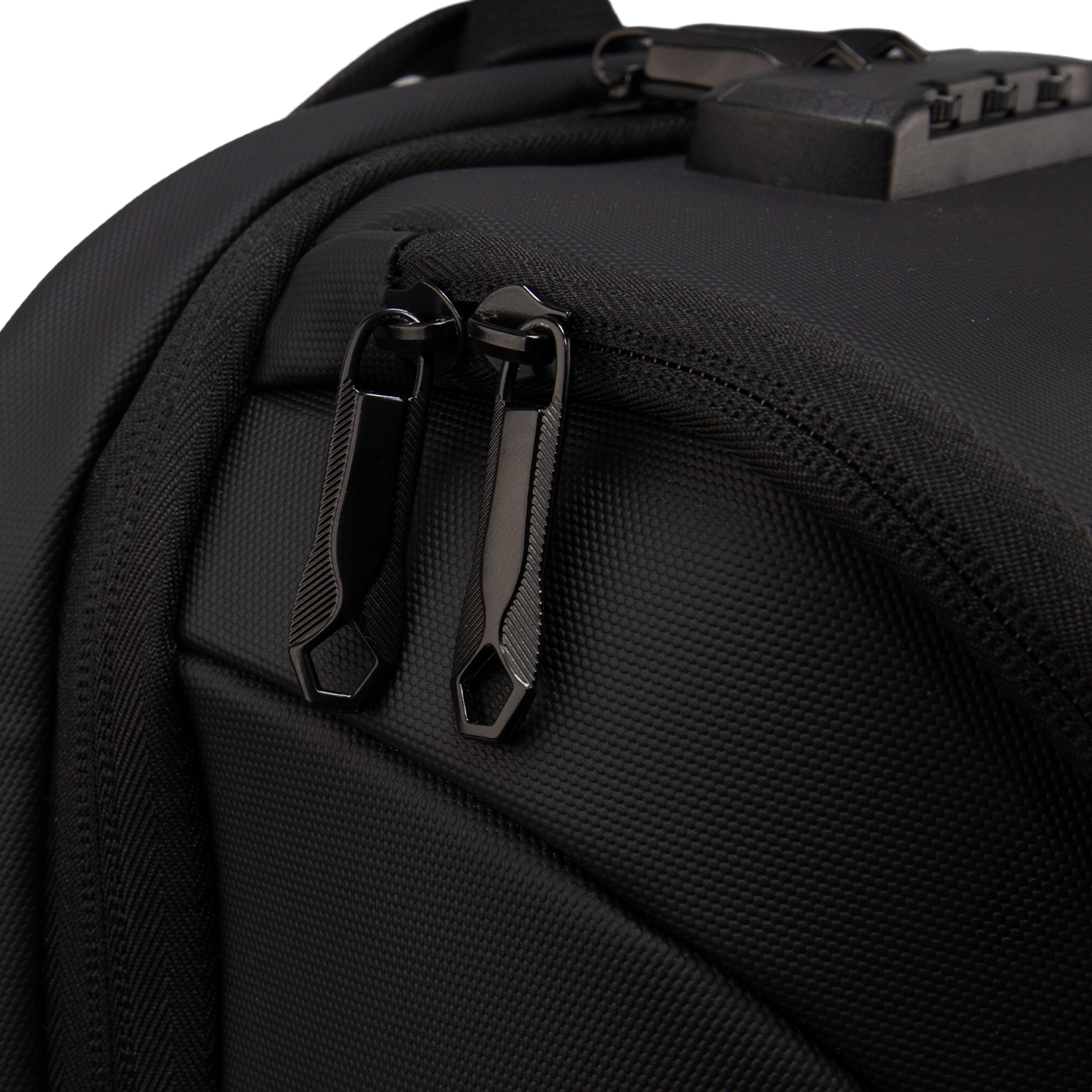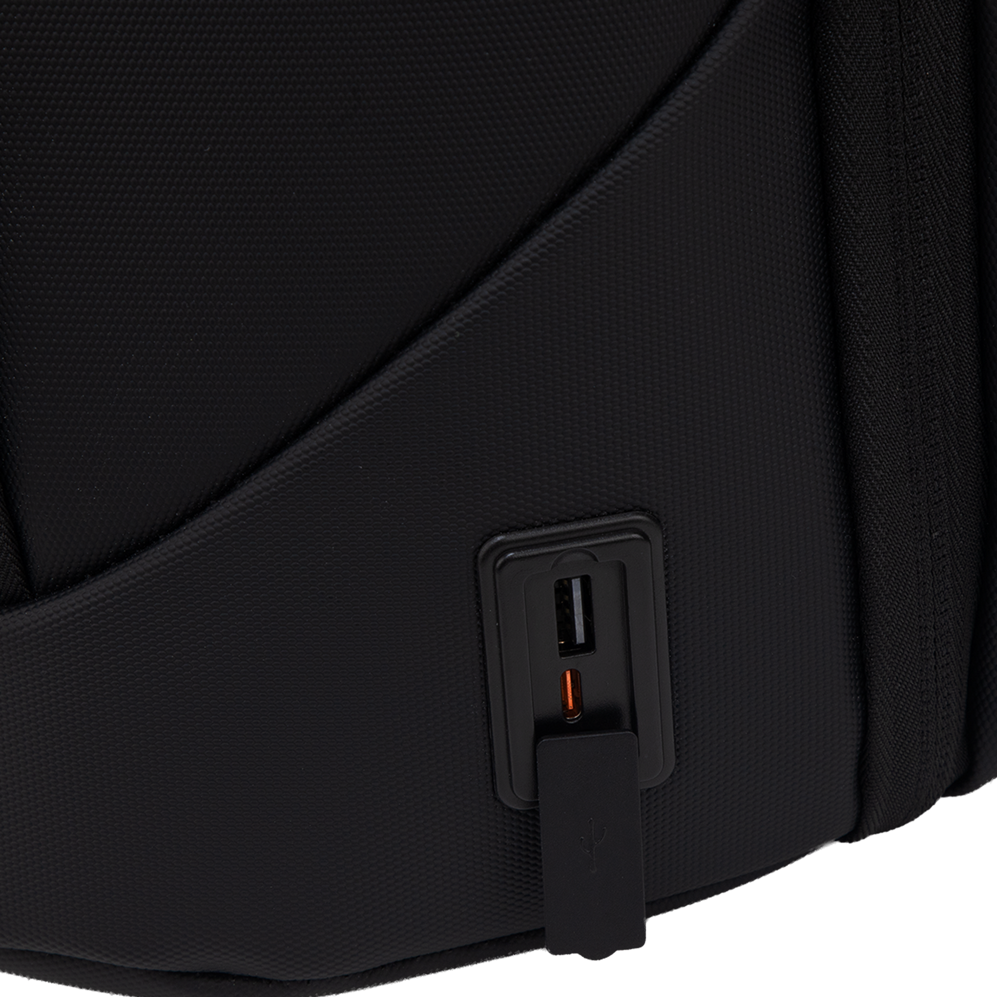 Equipped with USB and Type C charging ports, a number lock, and a hidden back pocket for easy device charging and secure storage. -