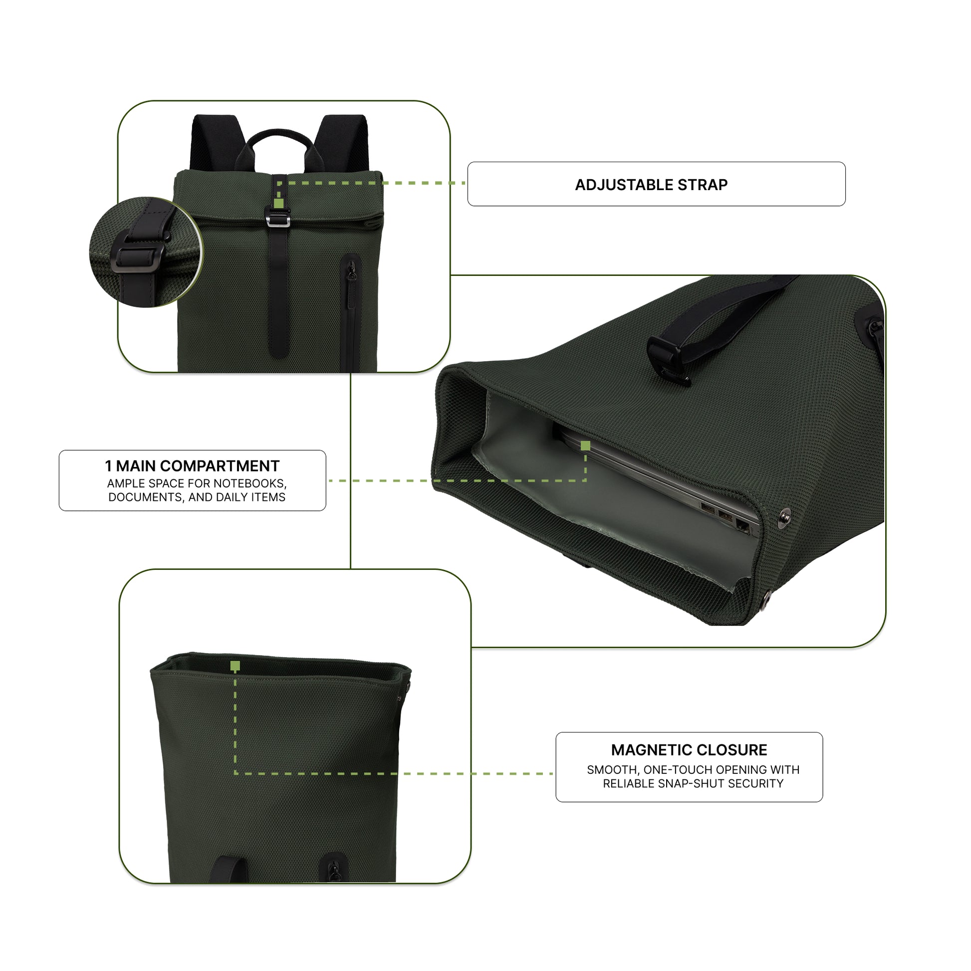 Inside, the backpack features a padded compartment that securely fits up to 17-inch laptops, offering dependable protection whether you’re commuting or working on the move. Its smart internal layout includes 1 main compartment and 1 front pocket, supported by a neatly designed organizer section to keep your chargers, cables, stationery and essentials perfectly arranged. Features an adjustable strap closure paired with a magnetic strip and dual side snap buttons, giving you secure, customizable and quick-access fastening.