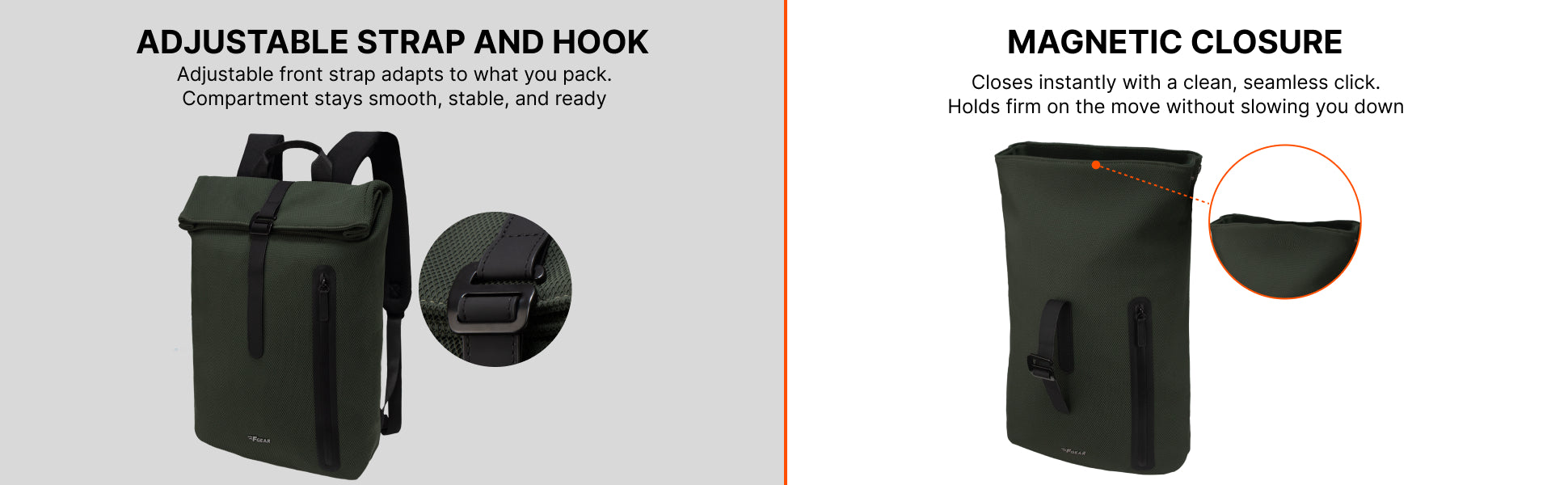 Inside, the backpack features a padded compartment that securely fits up to 17-inch laptops, offering dependable protection whether you’re commuting or working on the move. Its smart internal layout includes 1 main compartment and 1 front pocket, supported by a neatly designed organizer section to keep your chargers, cables, stationery and essentials perfectly arranged. Features an adjustable strap closure paired with a magnetic strip and dual side snap buttons, giving you secure, customizable and quick-access fastening.