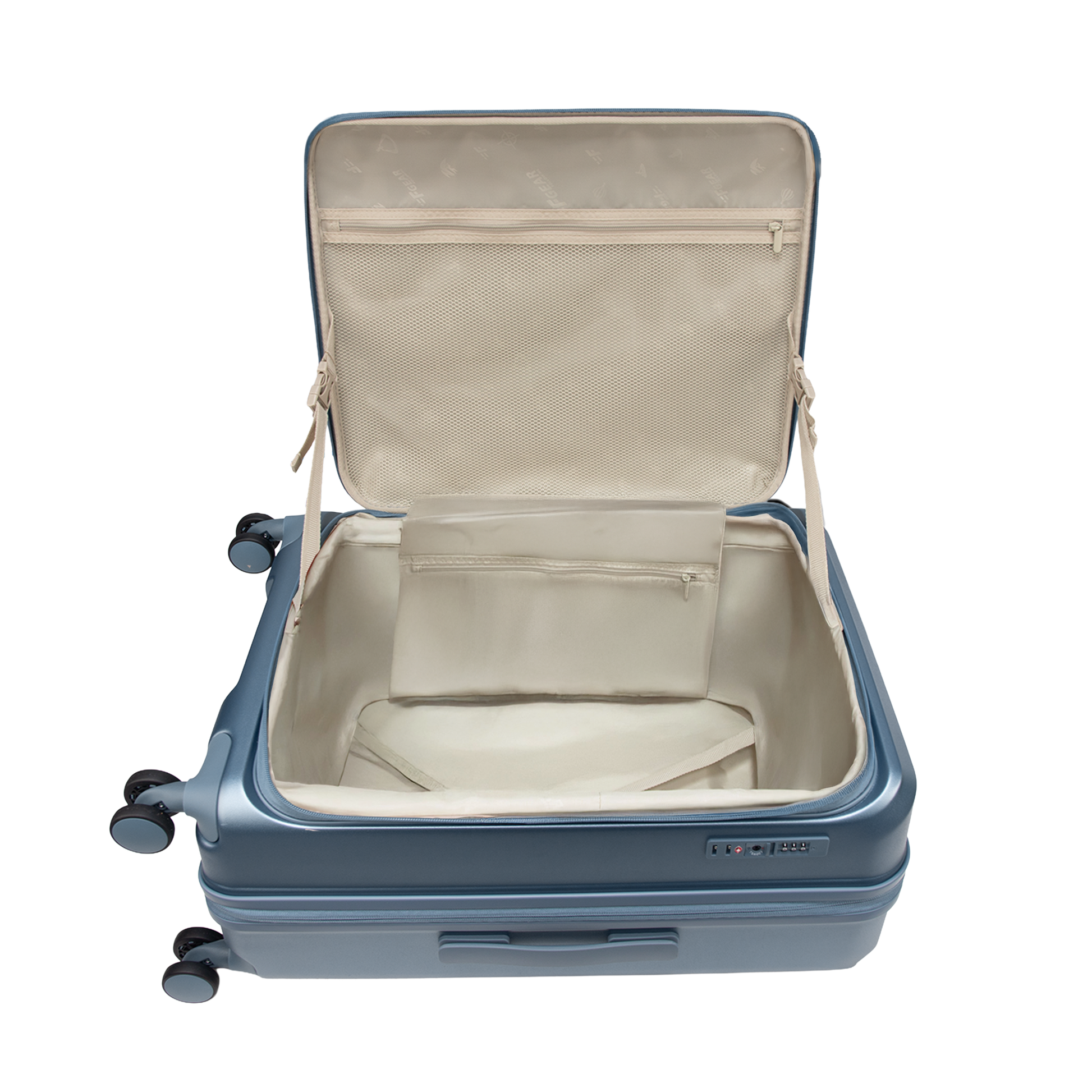 Inside, the Valencia offers a premium beige-lined interior with 2 organiser pockets for structured packing. An expander adds flexibility when you need extra room, while the included protective storage cover and magic eraser help maintain the suitcase’s fresh, clean appearance for years to come.