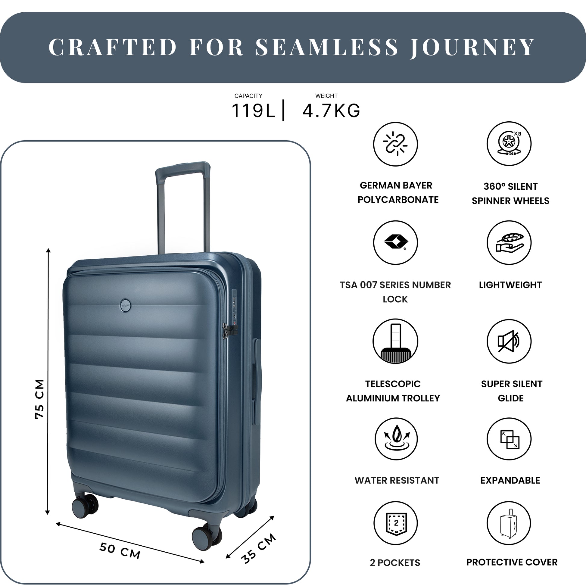 - Hard-Sided Premium Build – Crafted from durable German Makrolon Polycarbonate and paired with 8 Super Silent 360° spinner wheels for ultra-silent, effortless mobility.