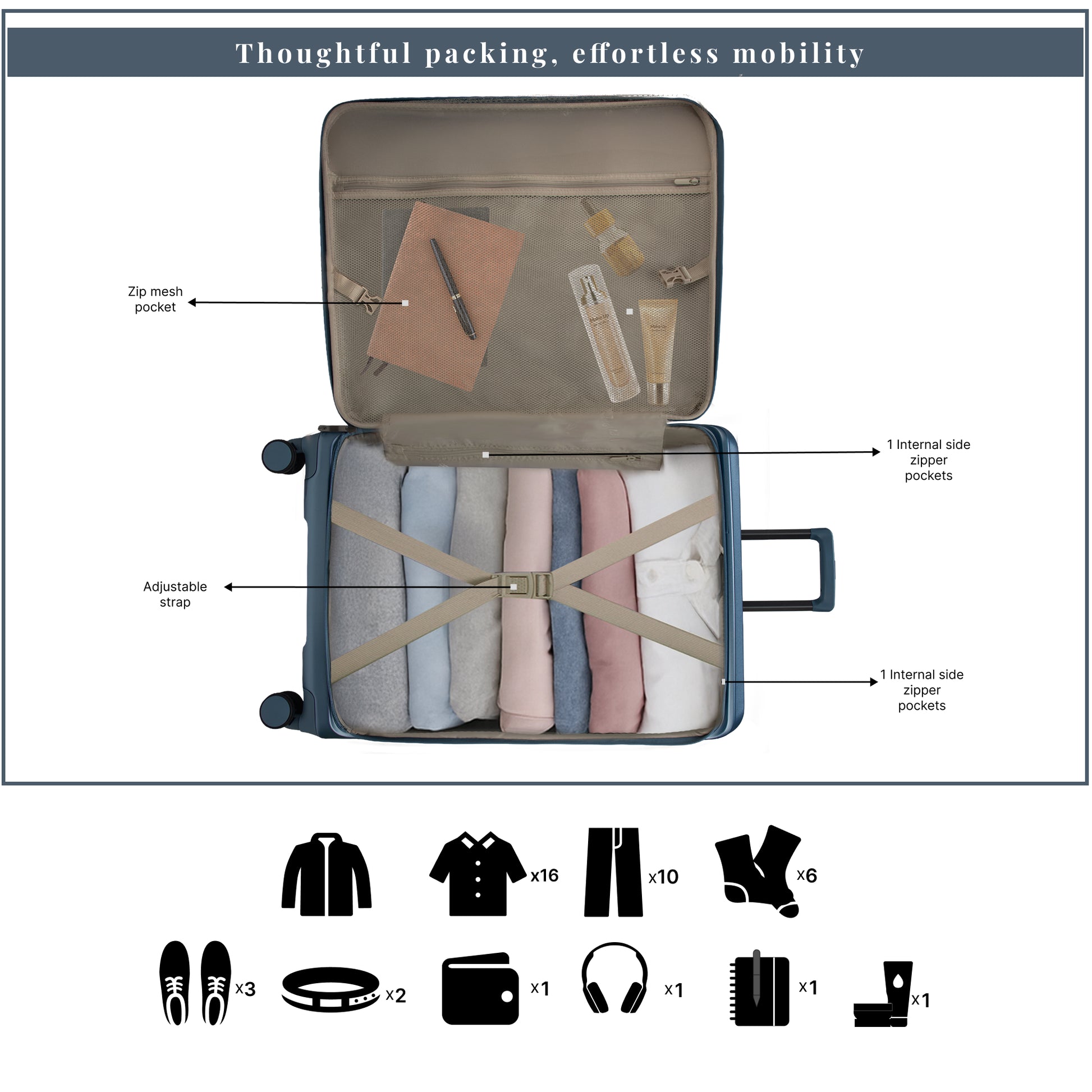 Inside, the Valencia offers a thoughtfully designed layout with premium beige lining and 2 organiser pockets to keep everything neatly arranged. The built-in expander adds extra packing capacity whenever needed. Every suitcase also comes with a protective storage cover and a magic eraser, ensuring your luggage stays clean, fresh, and well-protected trip after trip.