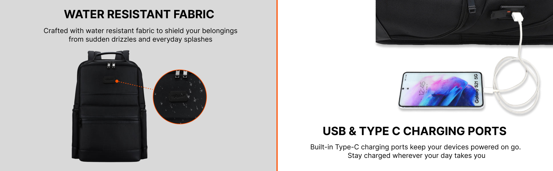 Designed with USB + Type-C charging ports, Varello ensures your devices remain powered through meetings, commutes and long trips. The padded laptop section fits up to 17-inch laptops, complemented by a dedicated tablet sleeve for enhanced utility. Engineered with an ergonomic molded foam back panel, it offers structured support, optimized ventilation and a refined, high-comfort carry experience.