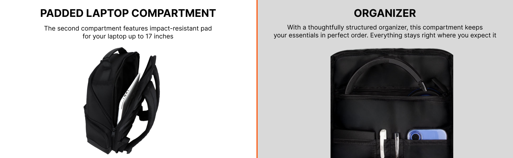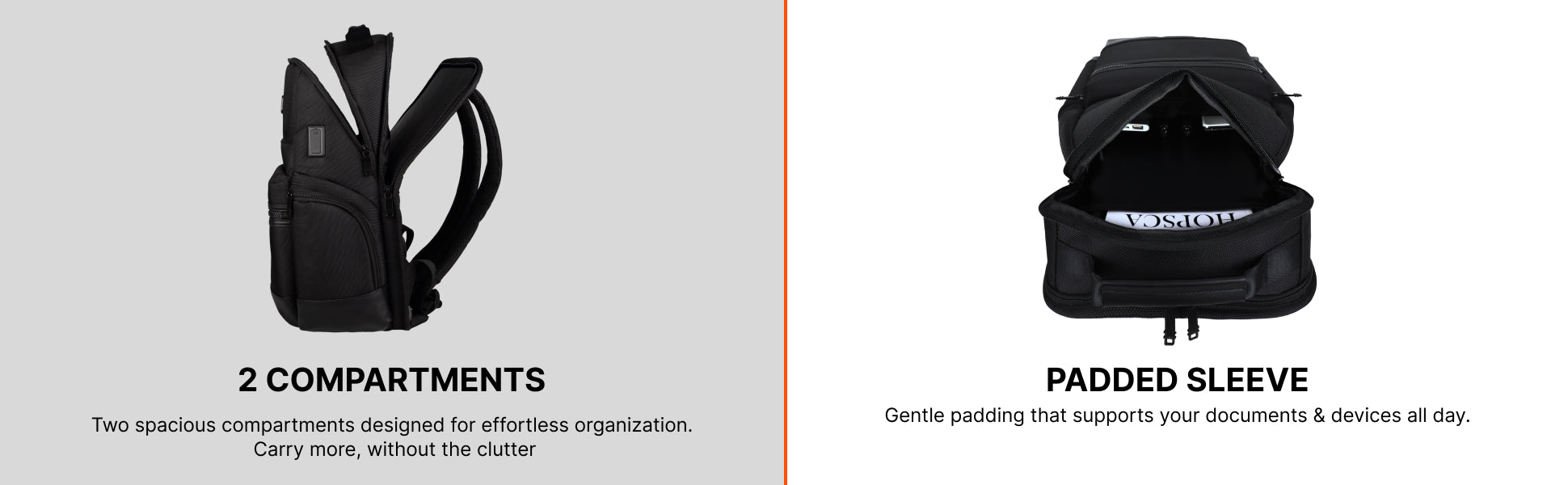 - Premium Spacious Build: A sleek, well-structured backpack crafted with 2 compartments for efficient organization of work, college and travel essentials. Engineered with an ergonomic molded foam back panel, it offers structured support, optimized ventilation and a refined, high-comfort carry experience.