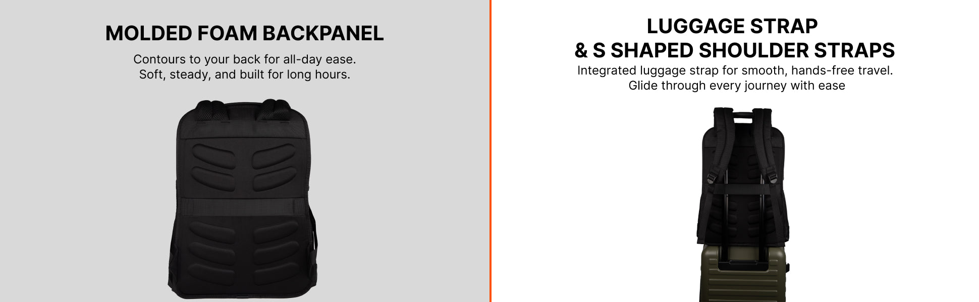 - Engineered with an ergonomic molded foam back panel, it offers structured support, optimized ventilation and a refined, high-comfort carry experience.