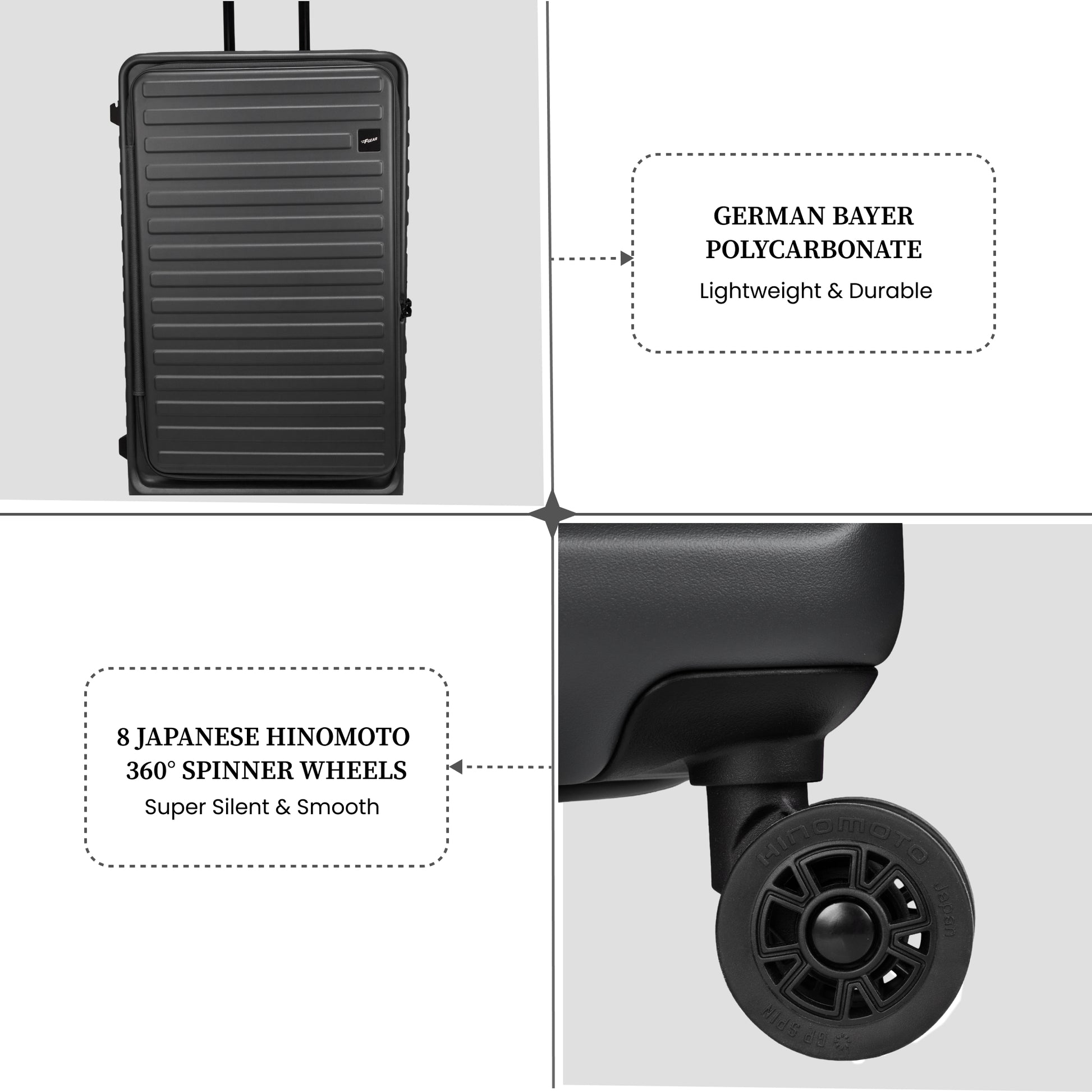 - Premium Mobility & Strong Build – Equipped with 8 Japanese Hinomoto 360° spinner wheels for smooth, silent movement and a durable German Polycarbonate shell that stays strong yet lightweight at 4.7 kg.