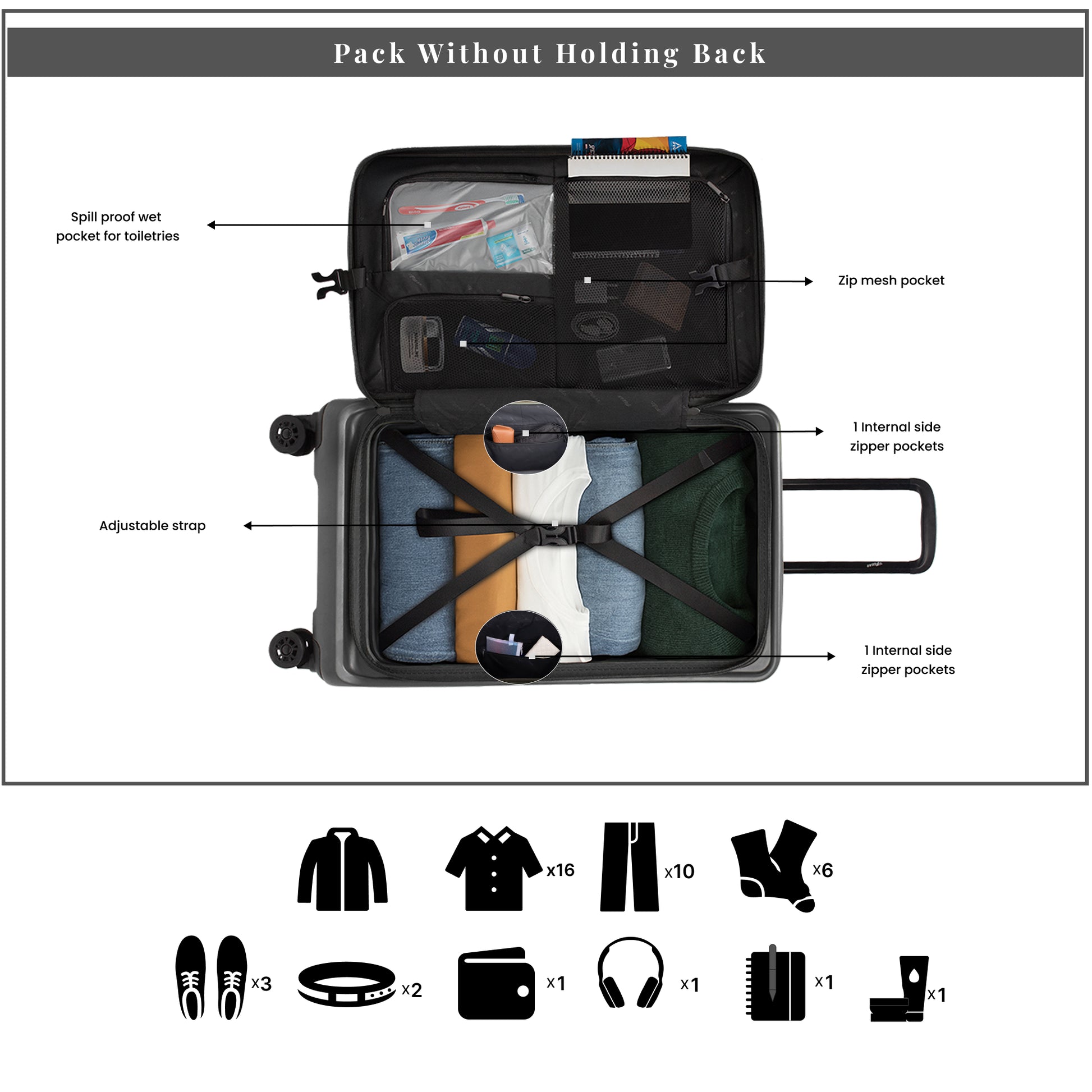 - Effortless Handling – Comes with a 3-level telescopic Aluminium trolley, along with comfortable top and side handles for easy lifting and manoeuvring during travel.